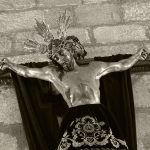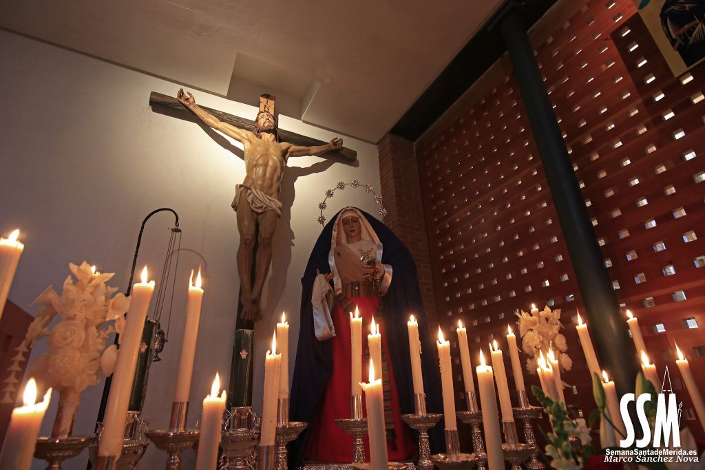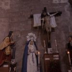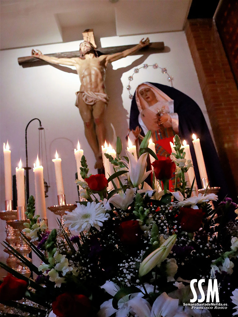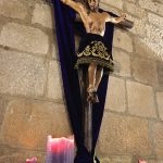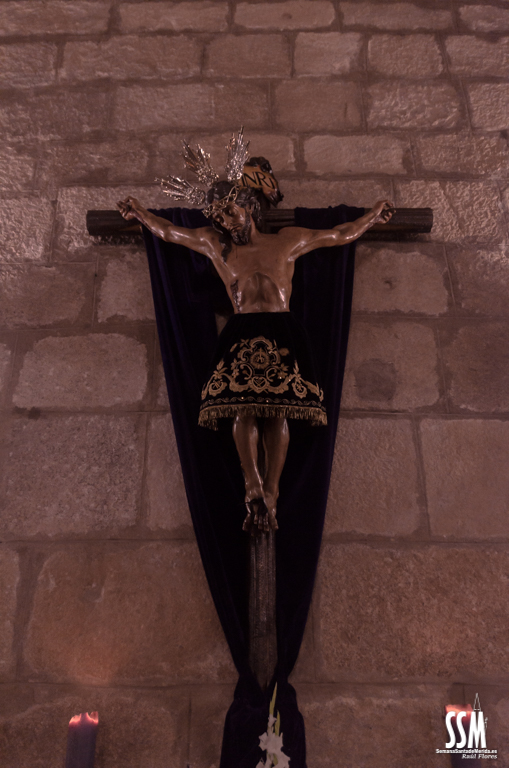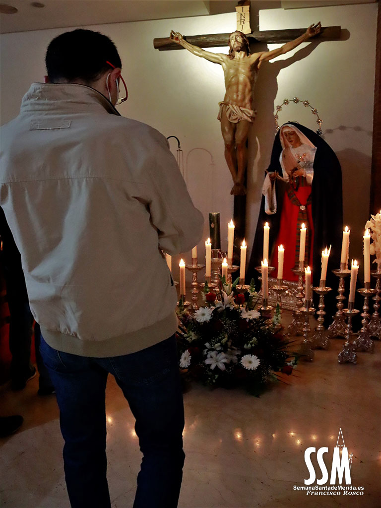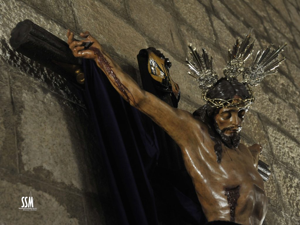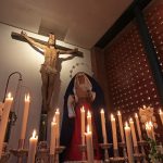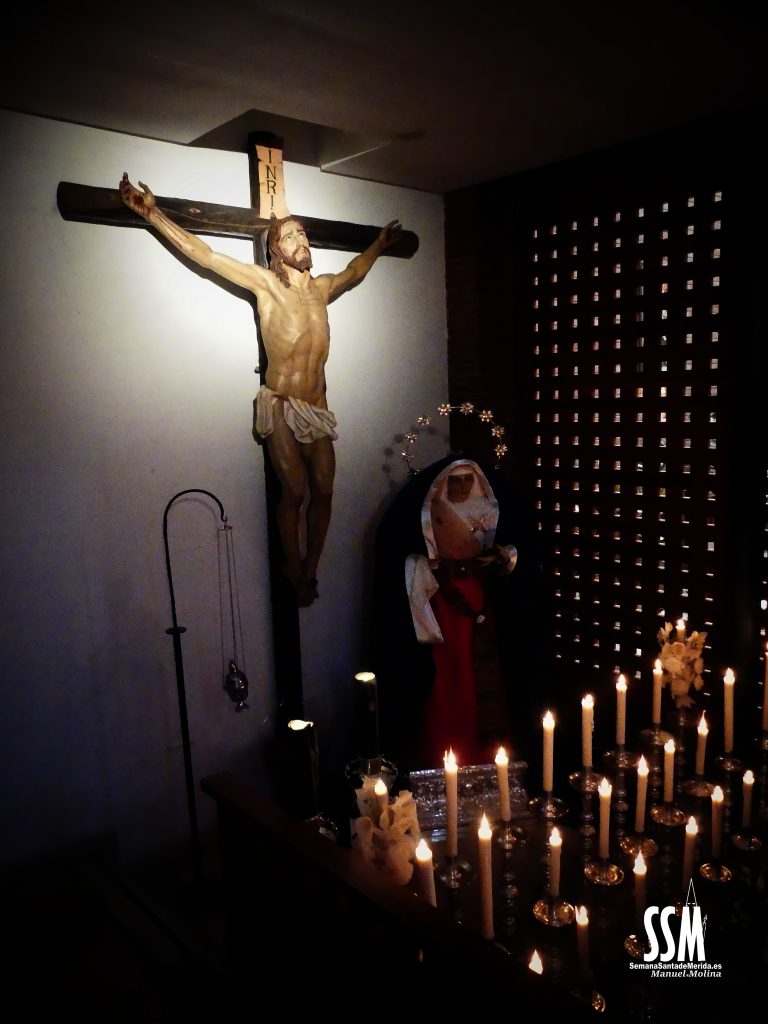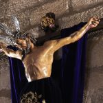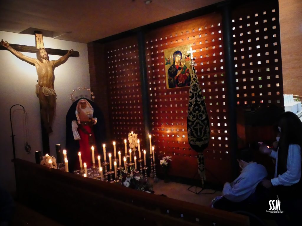 Todas las tonalidades del morado las encuentro en el altar del Santísimo Cristo de los Remedios que me regala para este cuadro otra estampa de antaño al aparecer con su cubresudario de terciopelo de Lyon con bordados en oro. El morado del terciopelo y el de los hachones contrastan con el negro del manto de Nuestra Señora del Mayor Dolor a los pies de la cruz, con la mirada perdida ante la muerte serena de Cristo que, por excelencia, se refleja en el rostro del Santísimo Cristo de los Remedios.