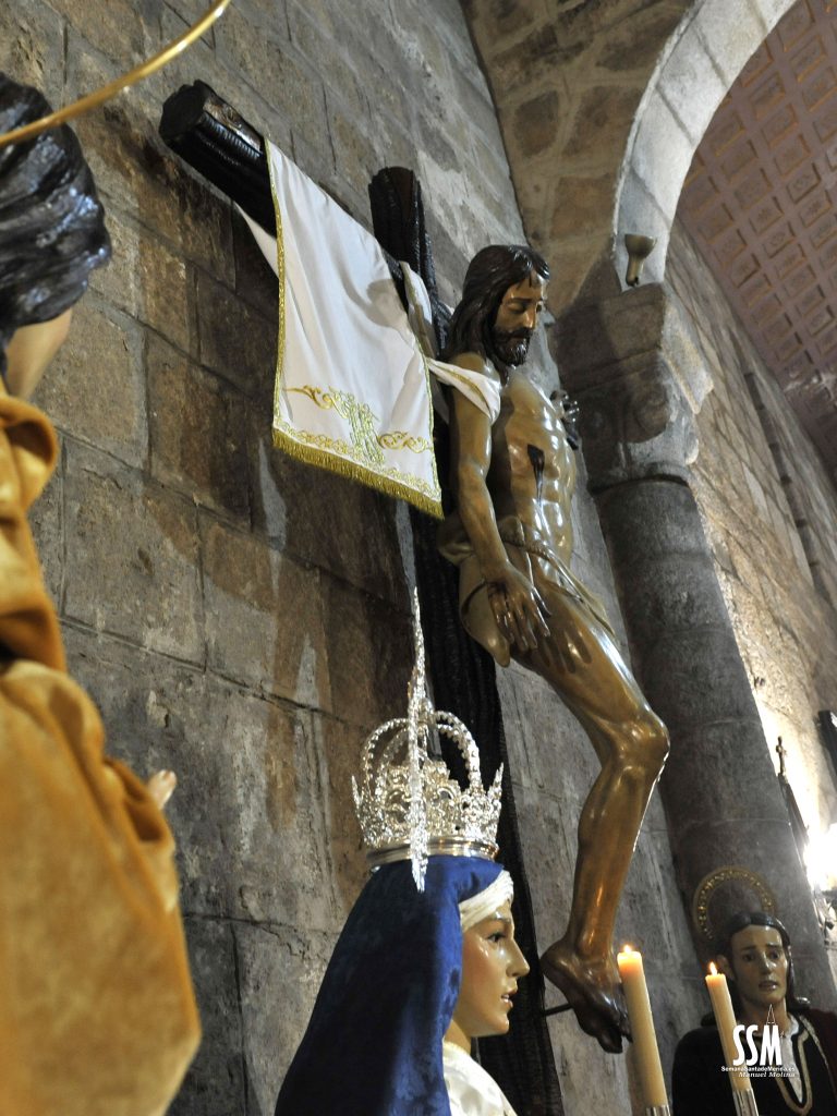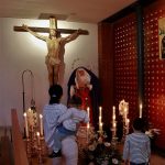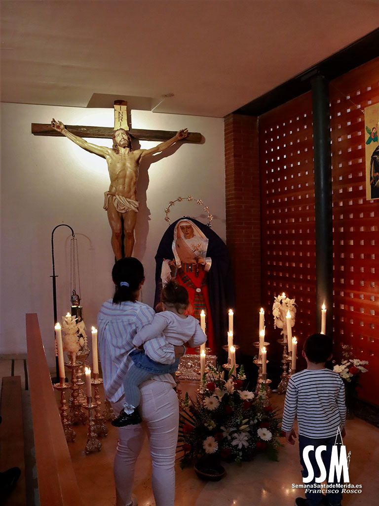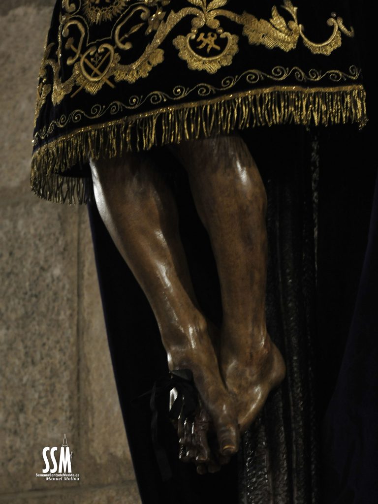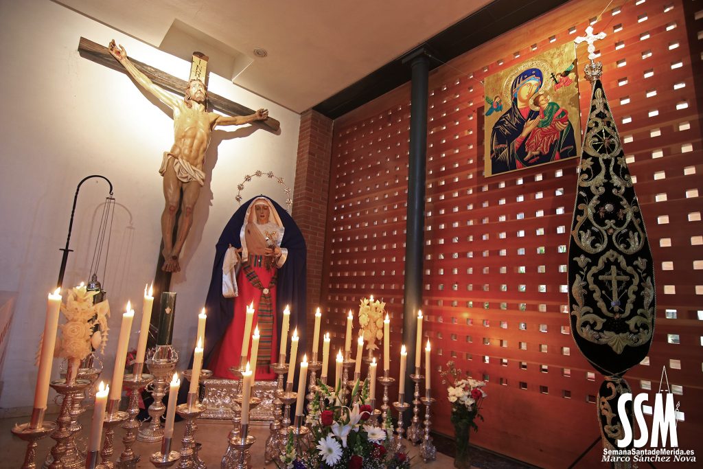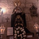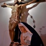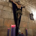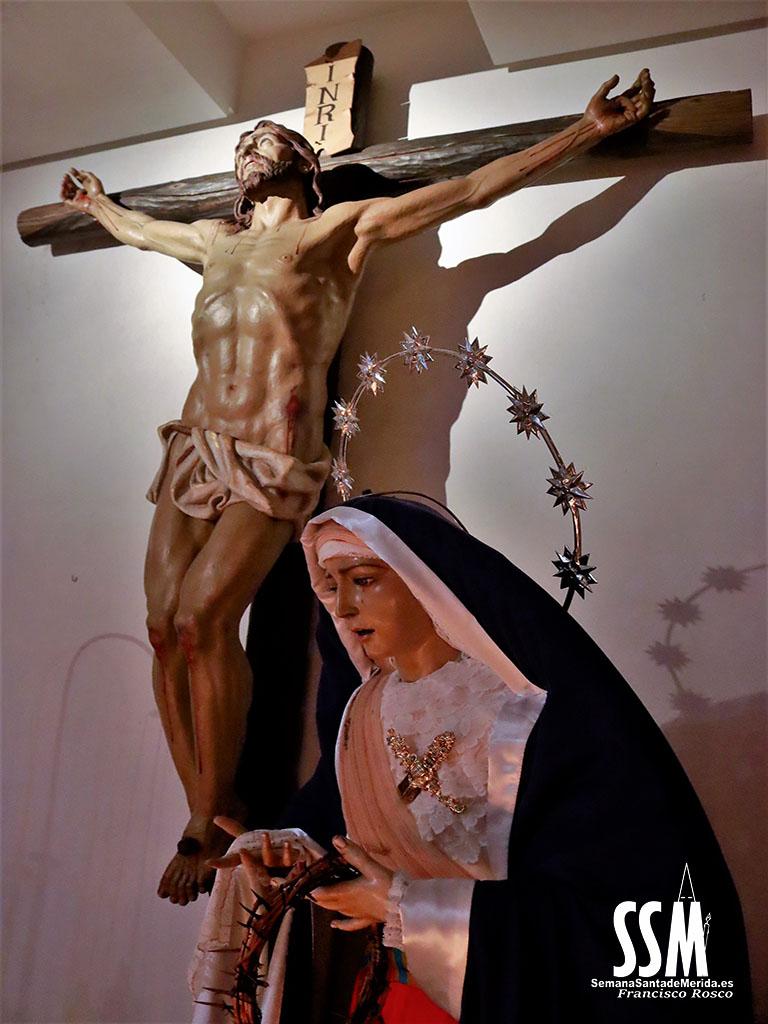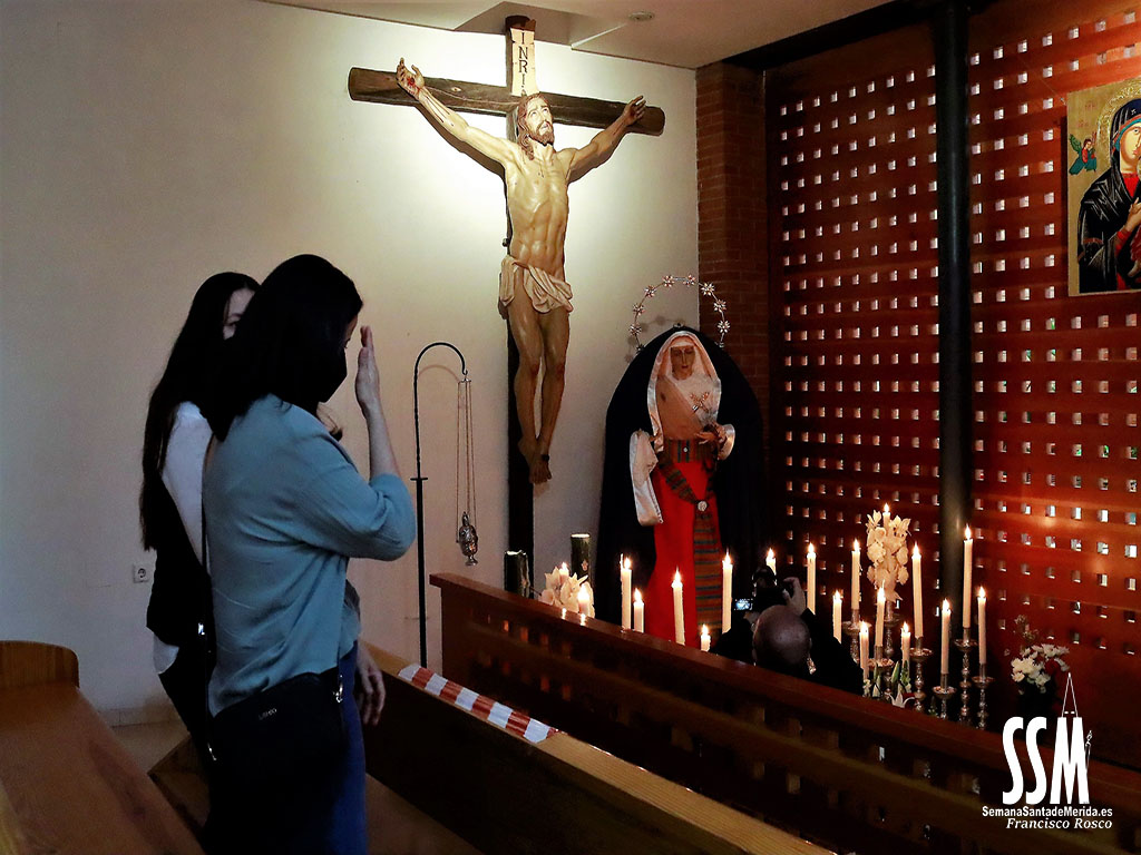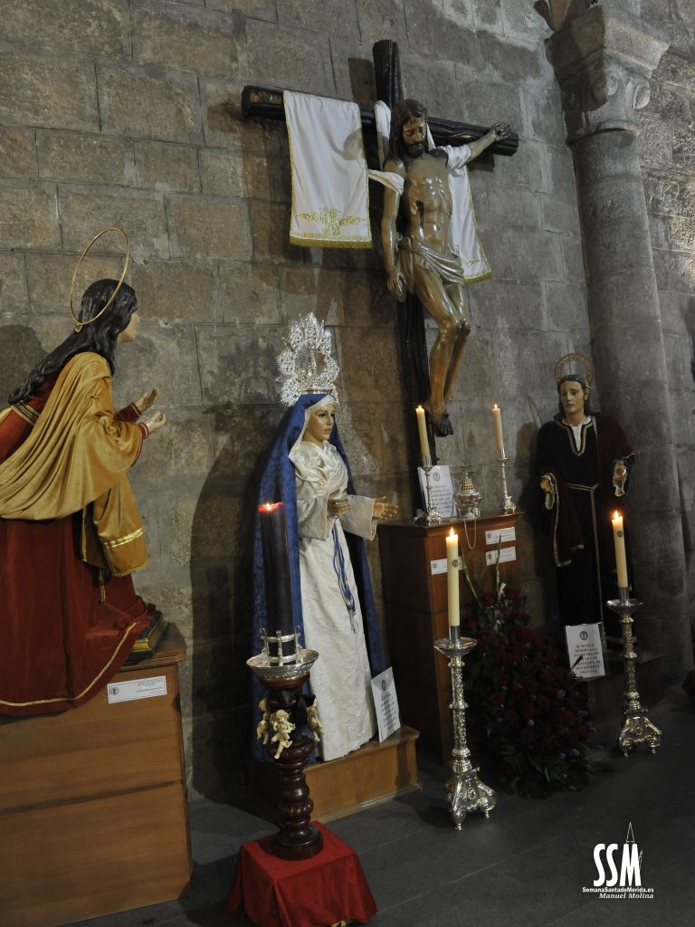 Todas las tonalidades del morado las encuentro en el altar del Santísimo Cristo de los Remedios que me regala para este cuadro otra estampa de antaño al aparecer con su cubresudario de terciopelo de Lyon con bordados en oro. El morado del terciopelo y el de los hachones contrastan con el negro del manto de Nuestra Señora del Mayor Dolor a los pies de la cruz, con la mirada perdida ante la muerte serena de Cristo que, por excelencia, se refleja en el rostro del Santísimo Cristo de los Remedios.