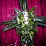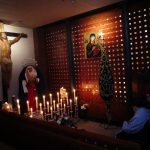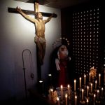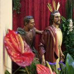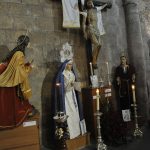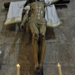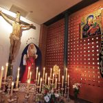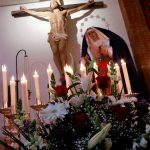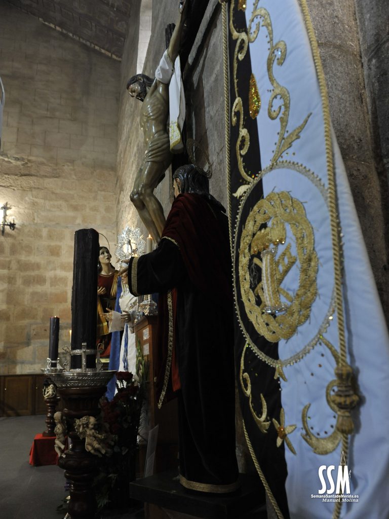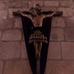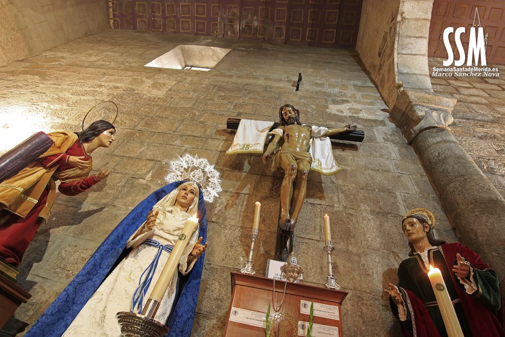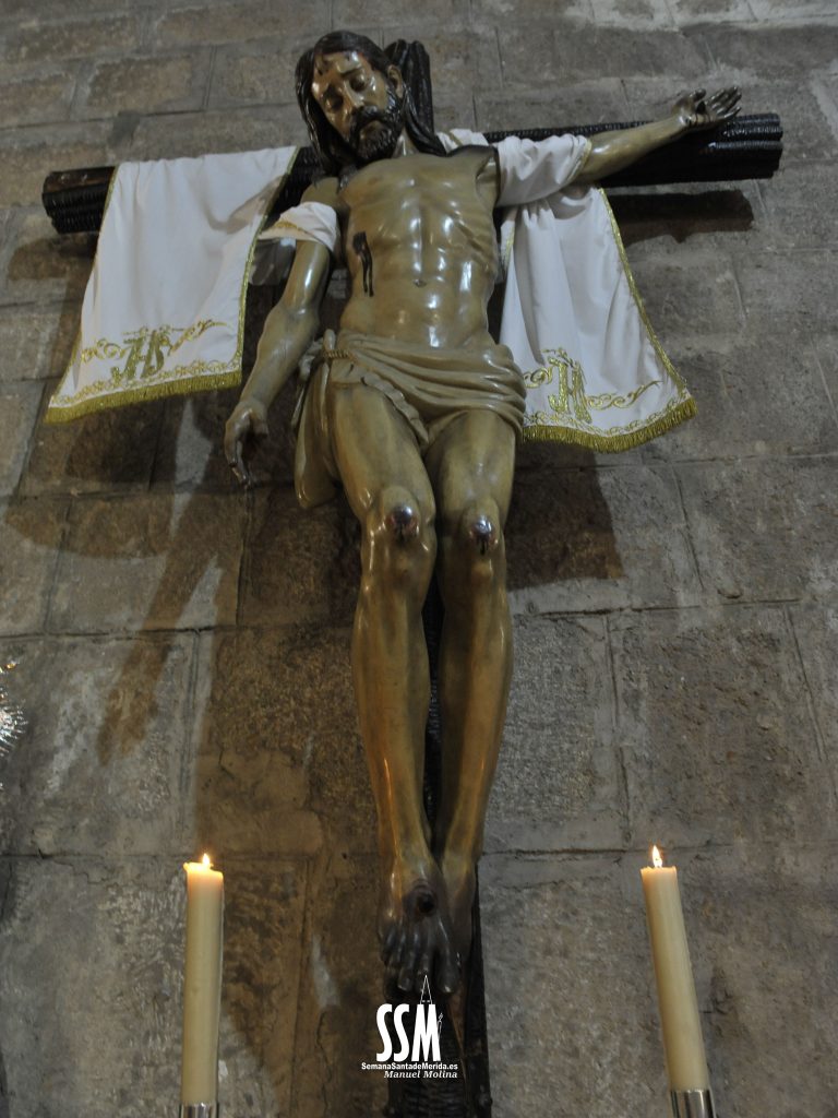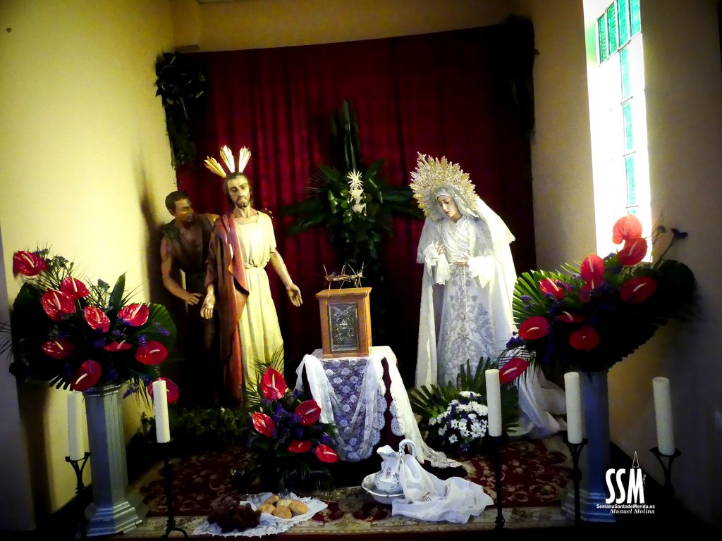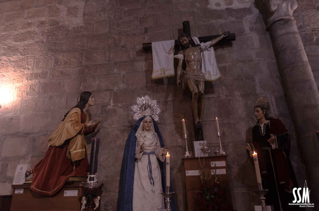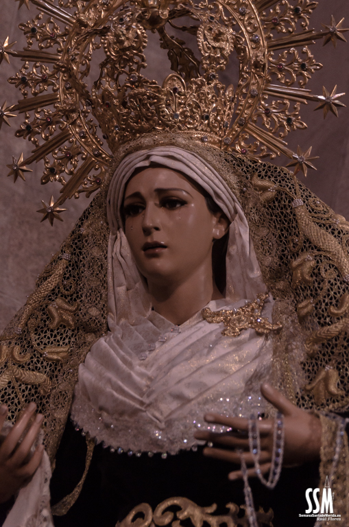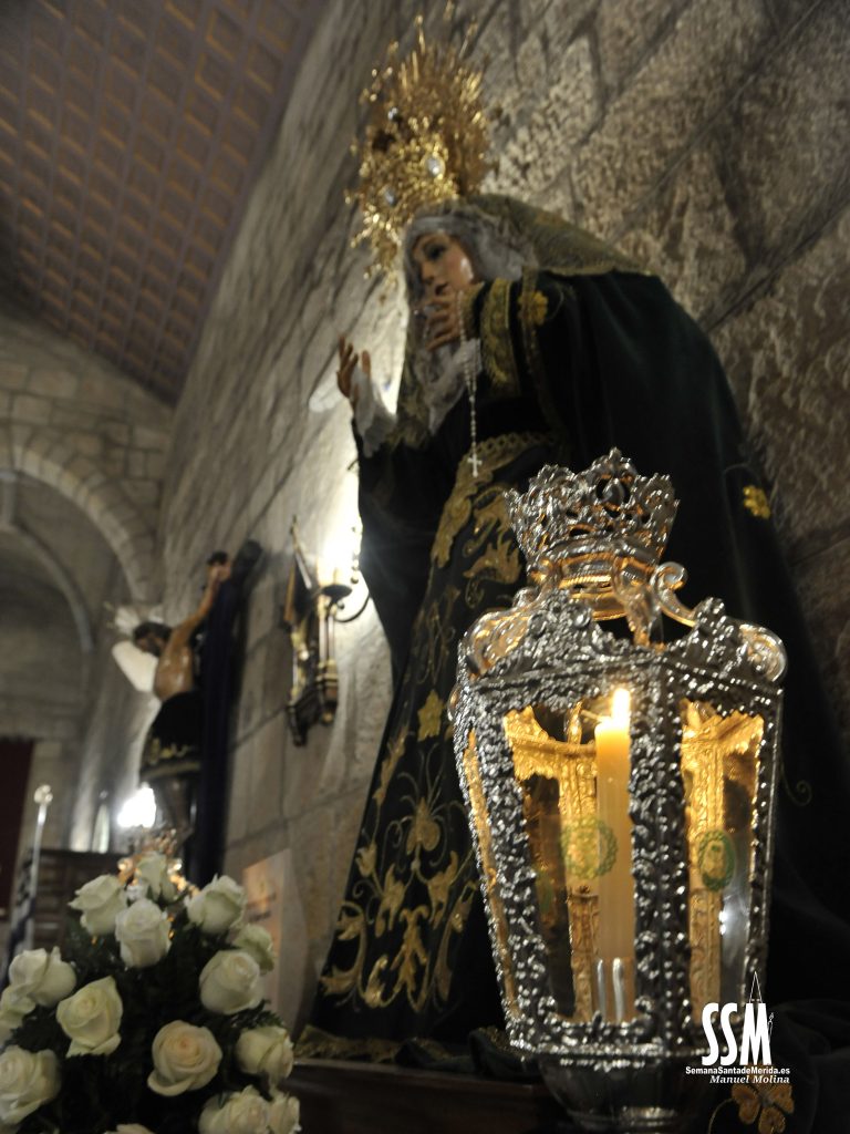 Todas las tonalidades del morado las encuentro en el altar del Santísimo Cristo de los Remedios que me regala para este cuadro otra estampa de antaño al aparecer con su cubresudario de terciopelo de Lyon con bordados en oro. El morado del terciopelo y el de los hachones contrastan con el negro del manto de Nuestra Señora del Mayor Dolor a los pies de la cruz, con la mirada perdida ante la muerte serena de Cristo que, por excelencia, se refleja en el rostro del Santísimo Cristo de los Remedios.
