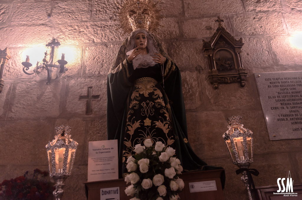 La Esperanza se aferra a los muros de Santa Eulalia. Ella reside allí y, humilde, sencilla, espera poder subir a su paso de palio para teñir de verde las calles de la ciudad.