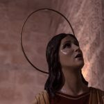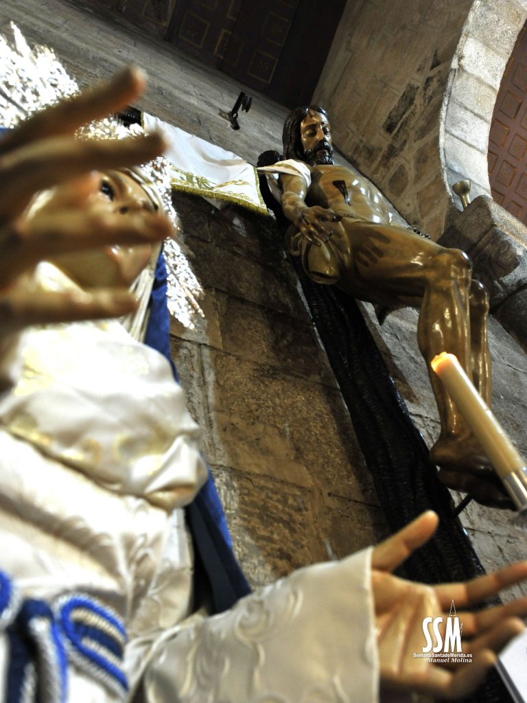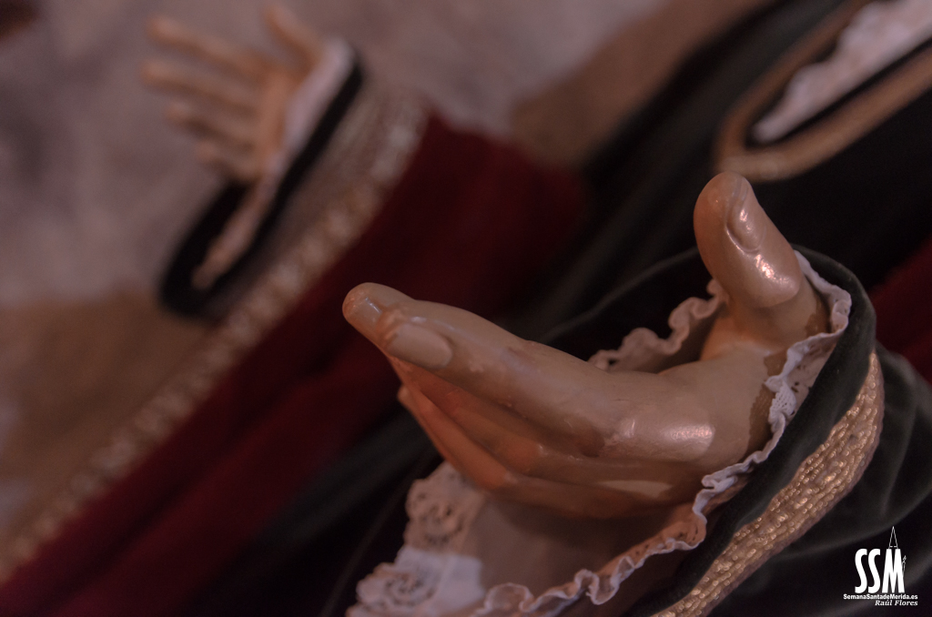 La Virgen del Amor Hermoso, esa belleza escondida que procesiona en el paso del Descendimiento, nos abre los brazos para darnos ese abrazo que, desde hace más de un año, no podemos darnos. Me regala un azul celeste que encaja a la perfección con el anaranjado manto de la magdalena, mientras me llevo una pincelada granate del mantolín de San Juan.
