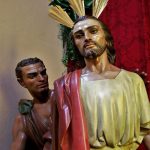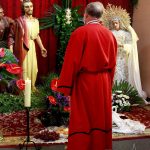 Buscando La Paz, consigo el amarillo y blanco en la fachada de Nuestra Señora del Rosario. Pero ese blanco no me servía ya que en su interior, radiante como siempre, el blanco estaba en el manto de la Virgen, esa gitana guapa que estaba escoltada por los hermanos de su cofradía. Ahí pude robar una pincelada en rojo del fiel Tomás Muñoz quien, como cada Jueves Santo, no dudó en ponerse la túnica para acompañar a sus titulares.