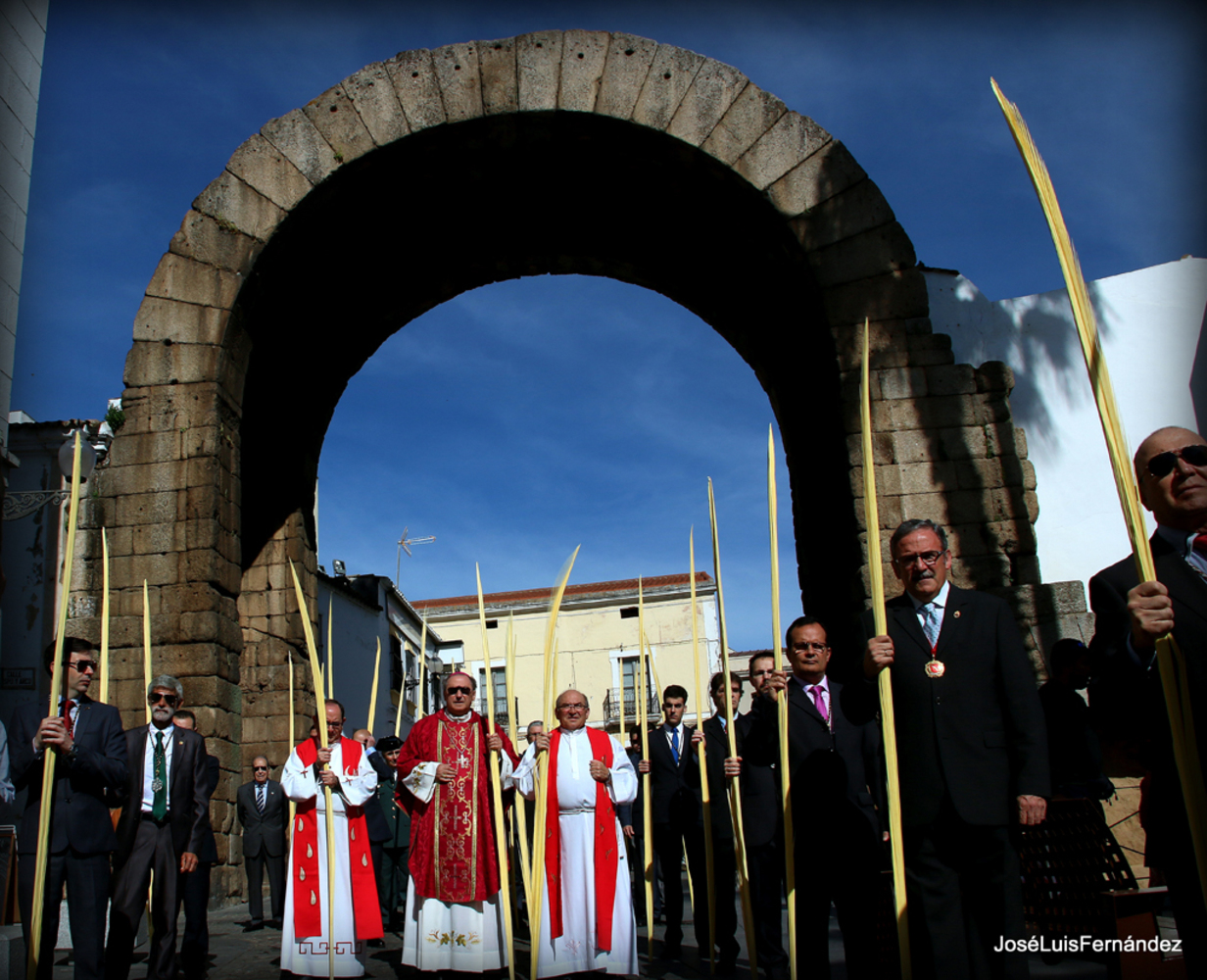 Tras la bendición, y bajo un radiante sol primaveral, se inicia la procesión. Tras la Cruz de guía, forman numerosos fieles, seguidos por los Hermanos Mayores de las todas las Hermandades, Cofradías y Asociaciones, que flanquean a nuestro Arzobispo-Coadjutor y a los Sacerdotes que le acompañan, y tras ellos las autoridades de la ciudad, todos ellos portando las palmas que acaban de ser bendecidas. El Coro Parroquial de la Concatedral de Santa María y la Banda Municipal de Música, aportan la nota musical de este acto. En su camino hacia la Concatedral, la procesión discurre por la Plaza de la Constitución, calle Alvarado y calle Trajano, siendo acompañada por numeroso público, que la acompaña también desde las aceras. A su paso bajo el Arco de Trajano, la comitiva reduce su ritmo, para poder disfrutar un instante de este momento, y poco a poco se va acercando a la Plaza de España. Al llegar a la esquina de Félix Valverde Lillo, ya se percibe el repicar de las campanas de Santa María y el rumor del gentío que allí se concentra.