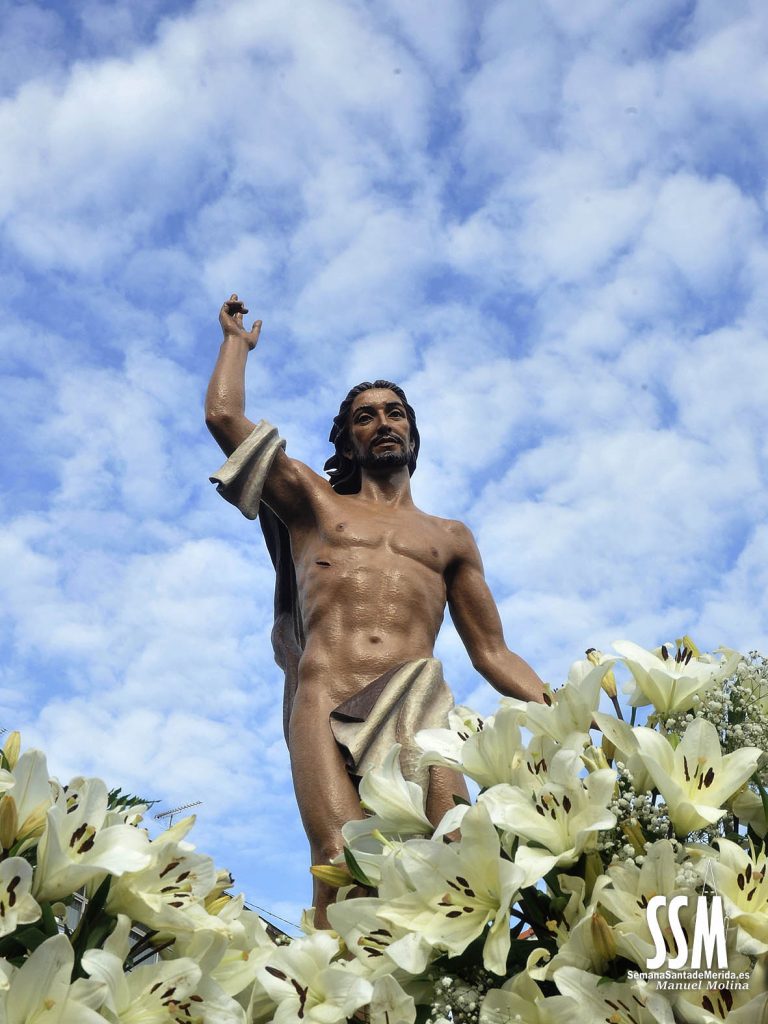 En 1952 procesiona por primera vez el Resucitado que la cofradía adquirió a la empresa olotina “Hijos de Ramón Bretcha” en un proyecto que, como siempre, se vió mermado por la cuestión económica ya que se pretendía que estuviera completado con dos romanos y dos mujeres. Finalmente, se quedó en el Cristo[7] que, en la actualidad, se venera bajo cesión en la Iglesia de Cristo Rey. En una primera etapa el Resucitado dejó de procesionar en 1962 volviéndolo a hacer en el año 1981.