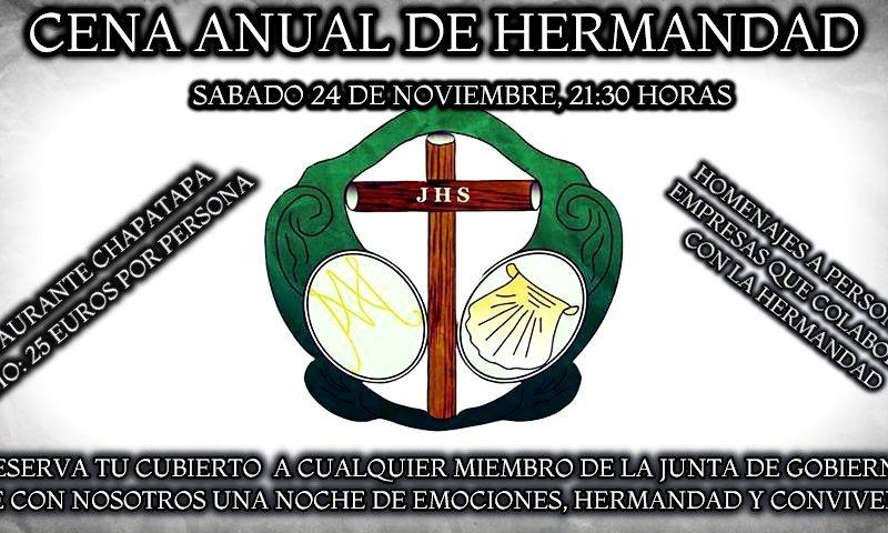 La Junta de Gobierno de la Hermandad de Jesús de la Humildad y María Stma. de las Lagrimas, por la presente le comunica el siguiente acto a realizar: CENA ANUAL DE HERMANDAD El próximo sábado 24 de noviembre, esta Hermandad realizará la