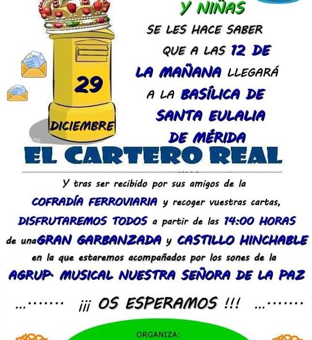 La Cofradía Ferroviaria comunica que el día 29 de diciembre tendremos la visita de un Paje Real de los Reyes Magos, donde todos los niños que lo deseen podrán ir a llevar sus cartas dirigidas a sus Majestades. A su vez