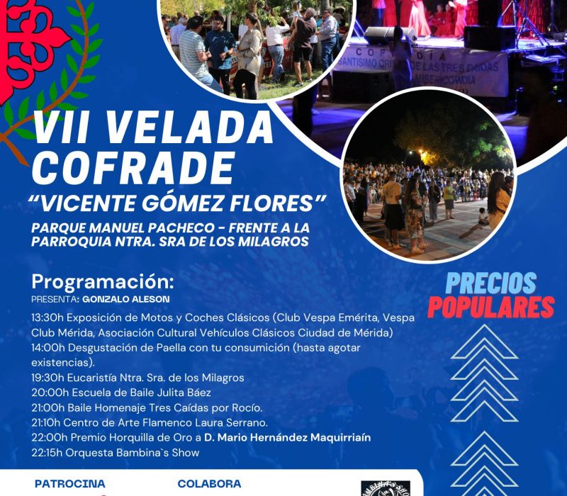 Este próximo sábado 5 de octubre tendrá lugar la VII Velada Cofrade “Vicente Gómez Flores”, organizada por la Cofradía del Stmo. Cristo de las Tres Caídas y Ntra. Sra. de la Misericordia. El evento se llevará a cabo en el