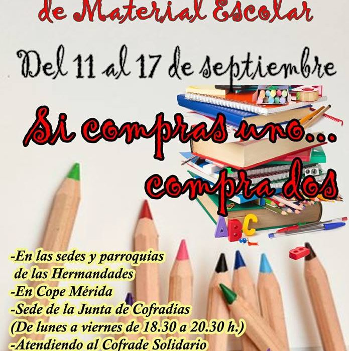 Porque si compras uno…intenta comprar dos para los más necesitados. Con motivo del comienzo del curso escolar, la Junta de Cofradías inicia una importante campaña solidaria para recabar material escolar. De esta manera, y junto a la Cadena COPE y el