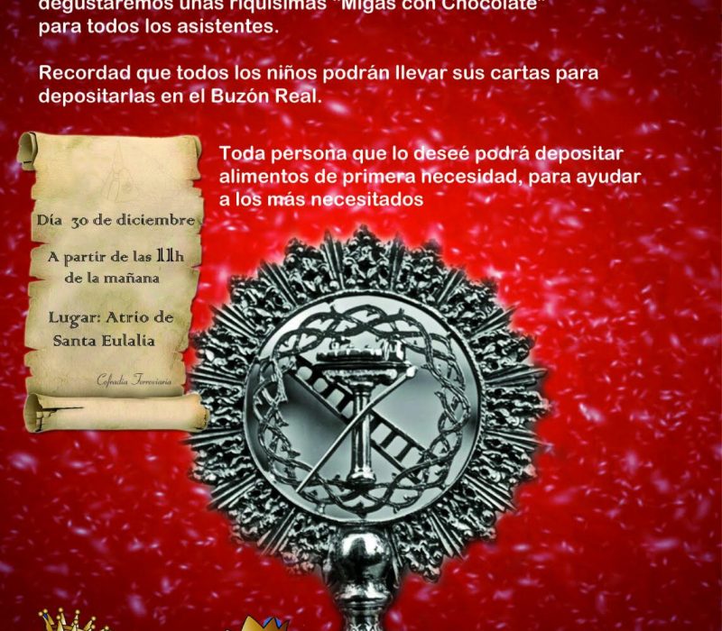 La Cofradía Ferroviaria comunica que le día 30 de diciembre tendremos la visita de un Paje Real de los Reyes Magos, donde todos los niños que lo deseen podrán ir a llevar sus cartas dirigidas a sus Majestades. A su vez