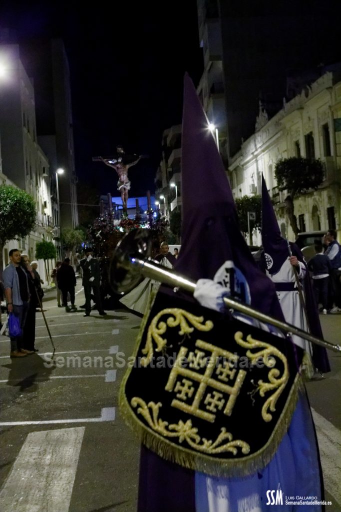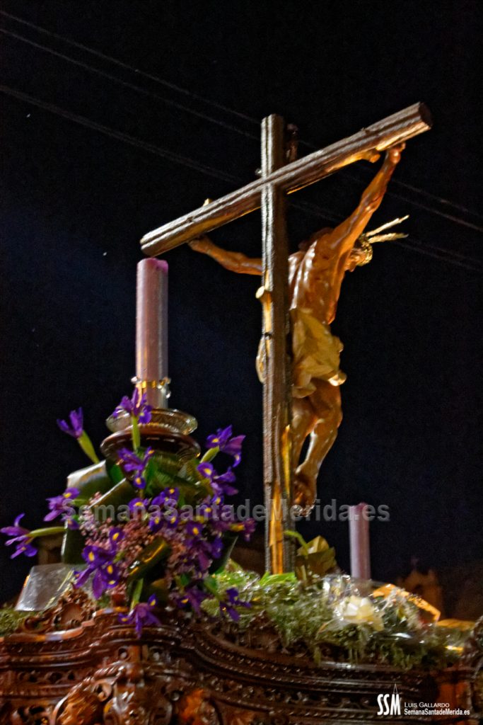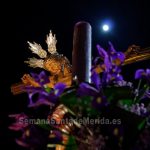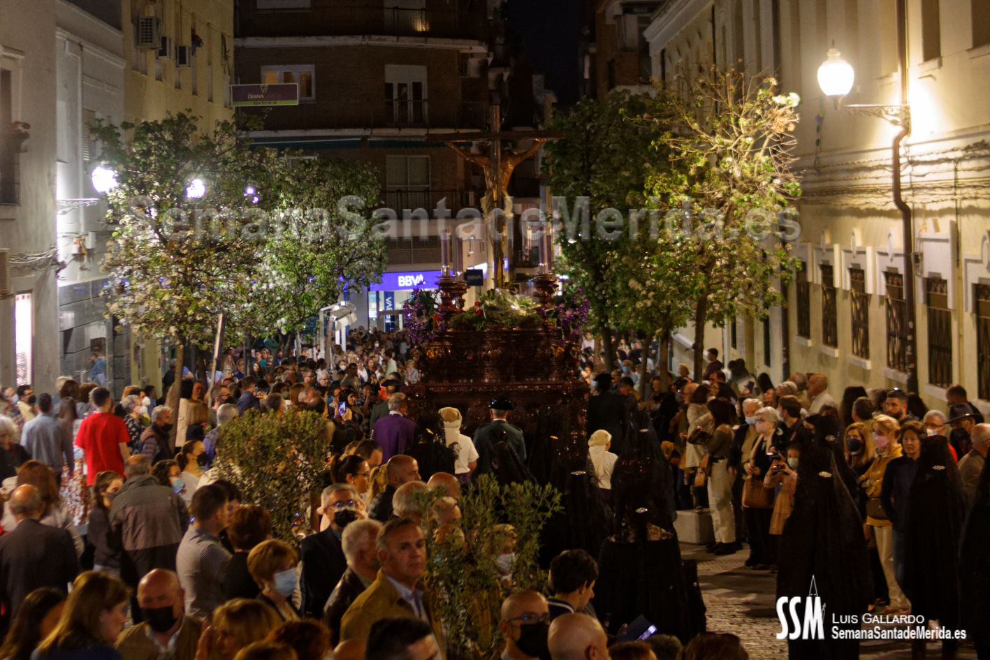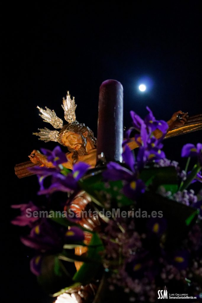 A los sones de la OJE de Mérida, el trono de caoba se plantó en el centro de la calle, avanzando, con su clásico rachear que parece que no quisiera despertar a un Cristo cuyos ojos, todavía, contemplan el último rayo de luz, en el momento justo de la muerte.