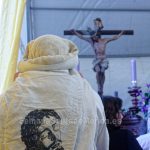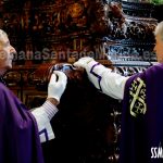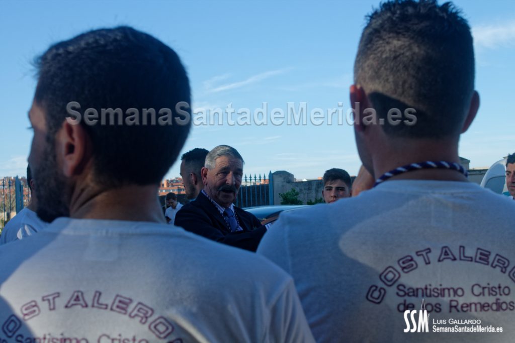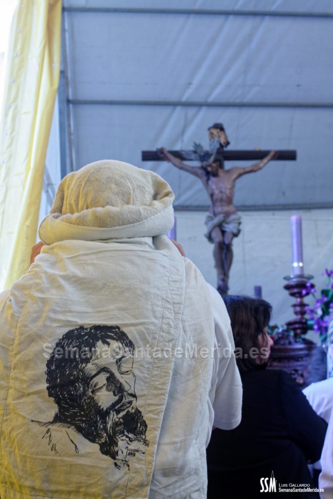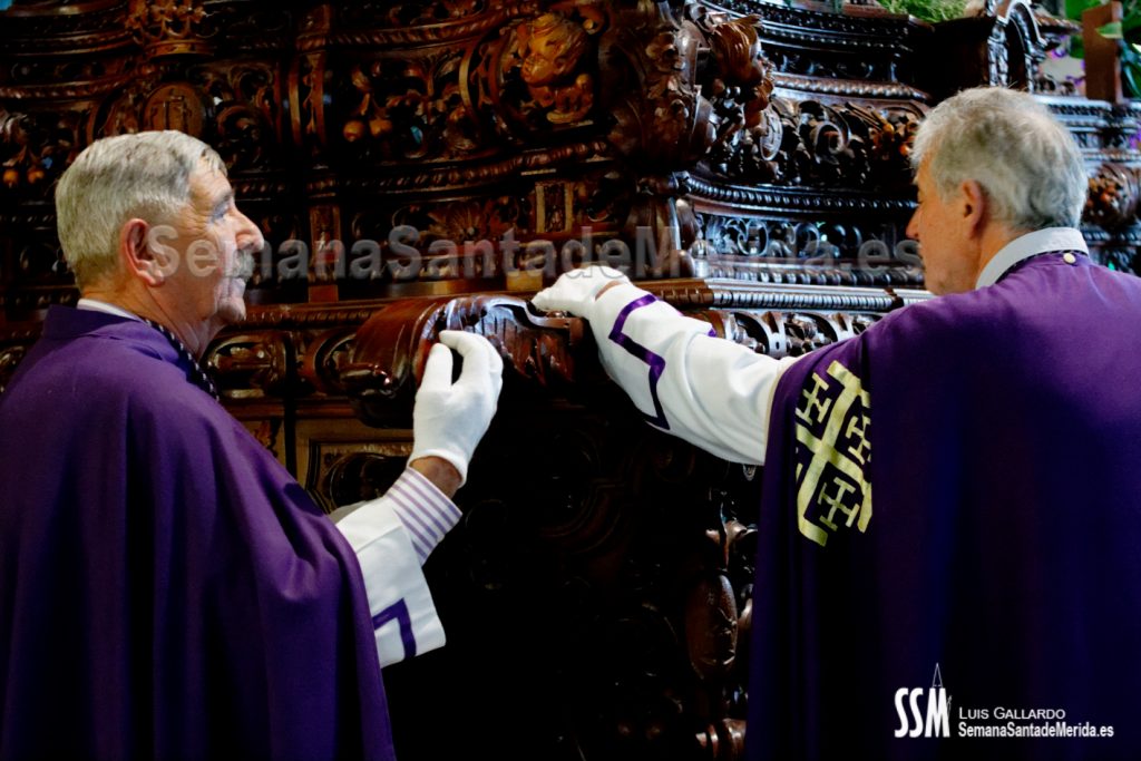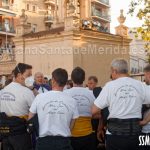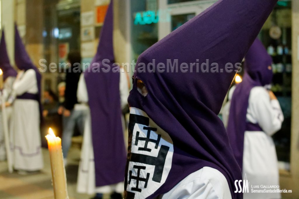 A los sones de la OJE de Mérida, el trono de caoba se plantó en el centro de la calle, avanzando, con su clásico rachear que parece que no quisiera despertar a un Cristo cuyos ojos, todavía, contemplan el último rayo de luz, en el momento justo de la muerte.