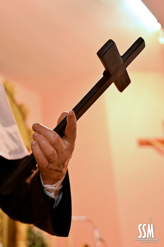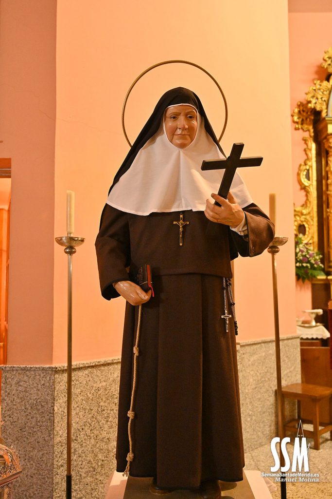 Una iglesia abarrotada esperaba el momento del inicio de la Eucaristía que daría paso a la bendición de la imagen de la Santa realizada por el escultor Jesús M. Romero, de Castilblanco de los Arroyos. Fue él quien, emocionado, nos explicó el proceso que ha llevado el trabajo desde que la Hermandad contactara con él hasta su llegada a Mérida.