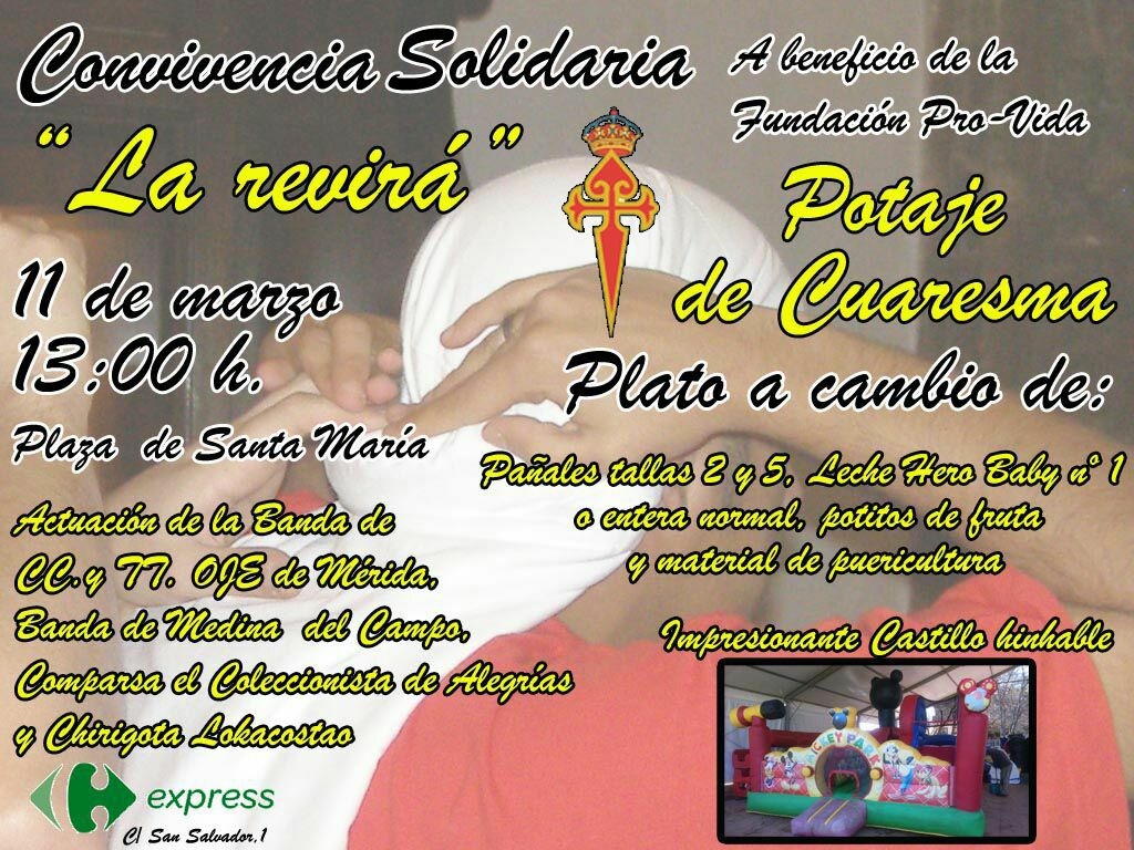 La Cofradía Infantil celebra el sábado 11 de Marzo a las 13:00h la Convivencia Solidaria «La Revirá». Esta convivencia será a beneficio de la Fundación Pro-Vida. Para ello se podrá colaborar llevando Pañales de las tallas 2 y 5, Leche Hero Baby nº 1 o entera normal, potitos de fruta y material de puericultura. A cambio por tu colaboración recibirás un plato de Potaje de Cuaresma. Tambíen habrá una barra con precios populares. Para amenizar el acto, actuará la Banda de Cornetas y Tambores de la OJE de Mérida, la Banda de Medina del Campo, comparsa El Coleccionista de Alegrías y la Chirigota Lokakostao. También habrá un impresionante castillo hinchable para los más pequeños.