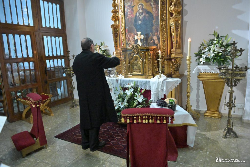 Los hermanos cofrades nos vamos arremolinando en torno a la puerta sin silencio aun, pero sin apenas una voz que sobresalga entre murmullos. Cada cual ocupa su lugar, no somos muchos, somos los suficientes y todos sabemos donde y cómo acompañar el cortejo.