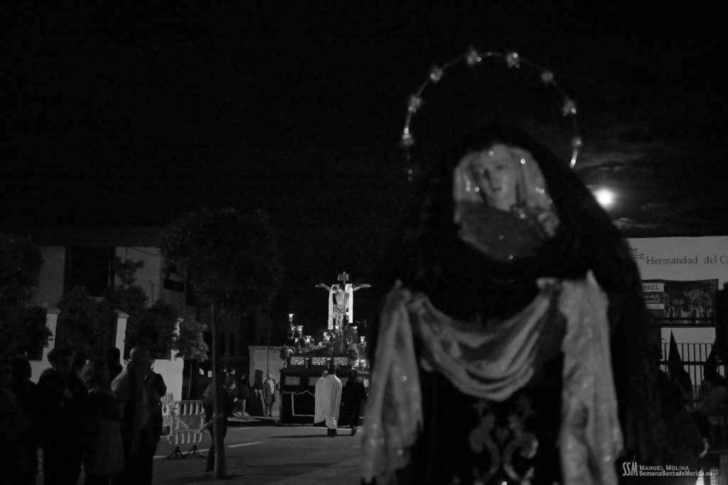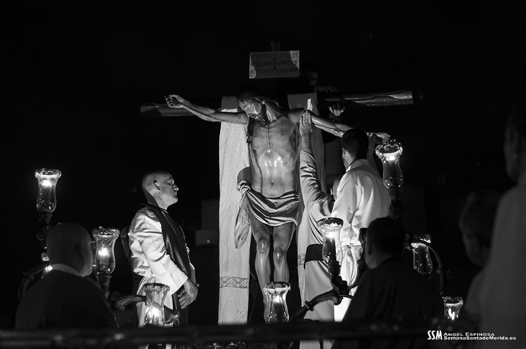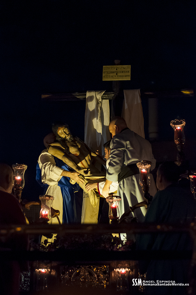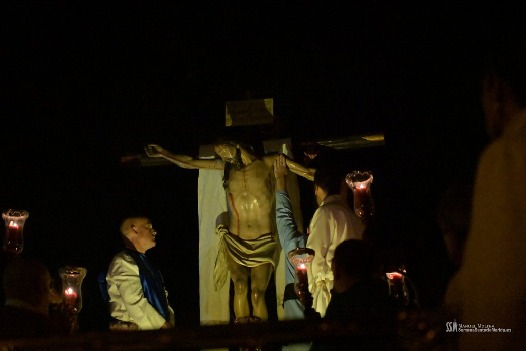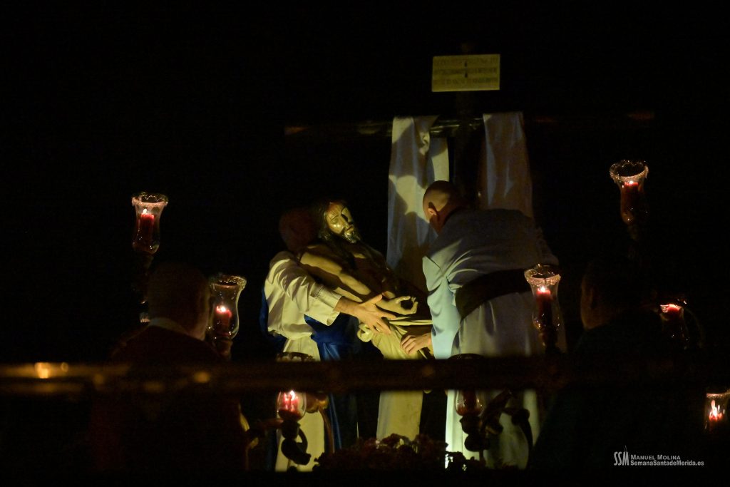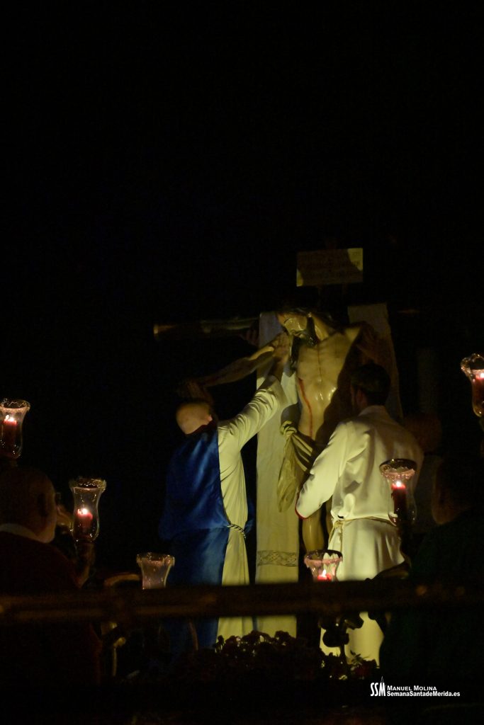 Una vez llegamos de vuelta a la Ermita, sabemos que llega el momento en el que la emoción aviva al alma y, entre la oración y el canto, se realiza el descendimiento del cuerpo inerte del Cristo del Calvario. No es espectacular, no es algo que inunde los sentidos, tal y como estamos acostumbrados a día de hoy. Al contrario, es un acto sobrio, sereno, profundo, plásticamente bello y sobrecogedor para aquéllos que hemos tenido la suerte de poder realizarlo y haber tenido en nuestras manos el peso del Señor. Los recuerdos brotan.