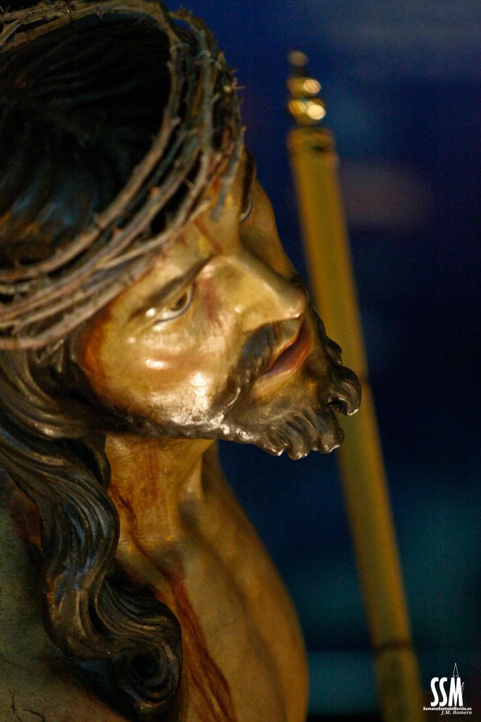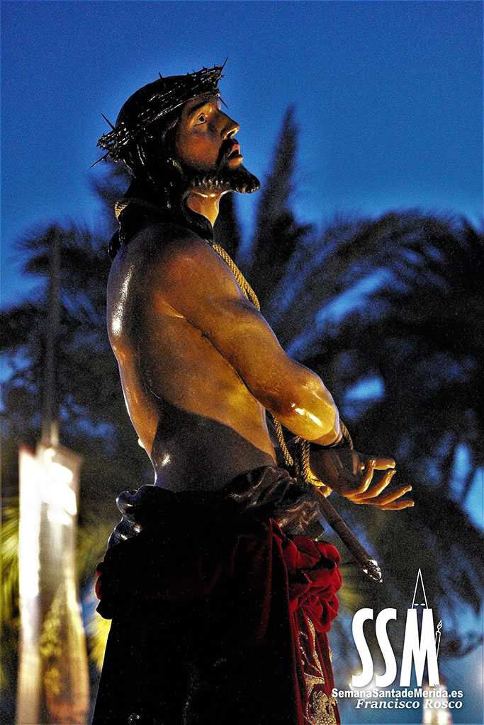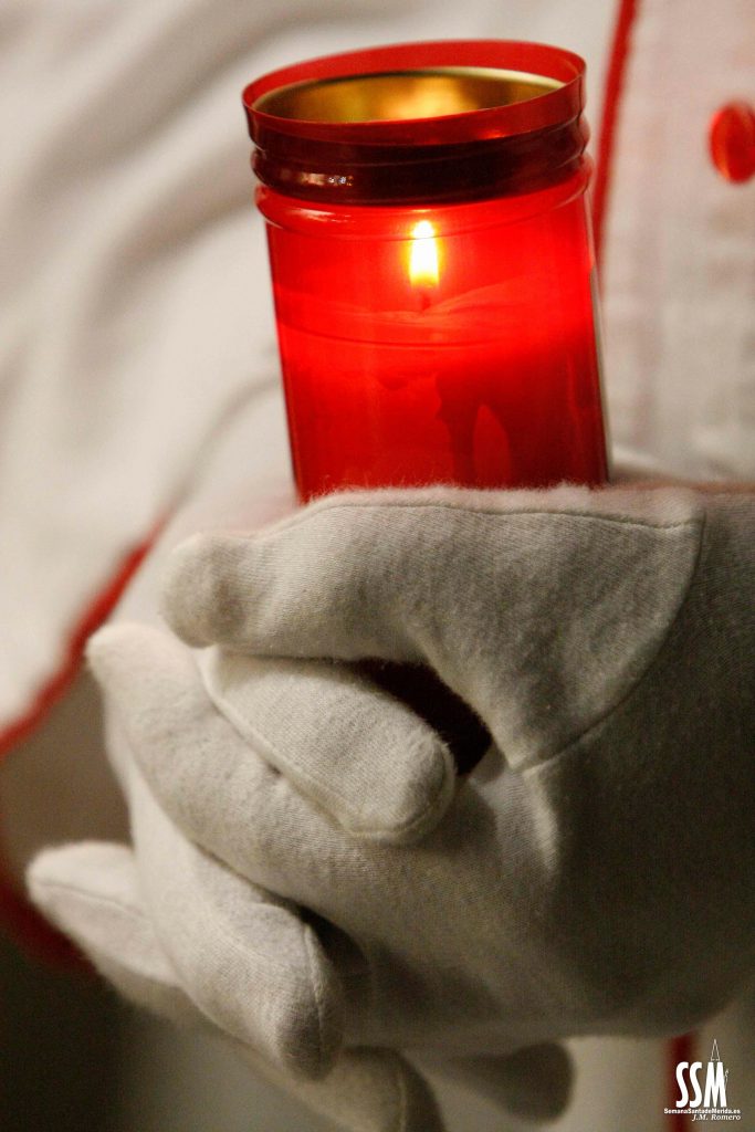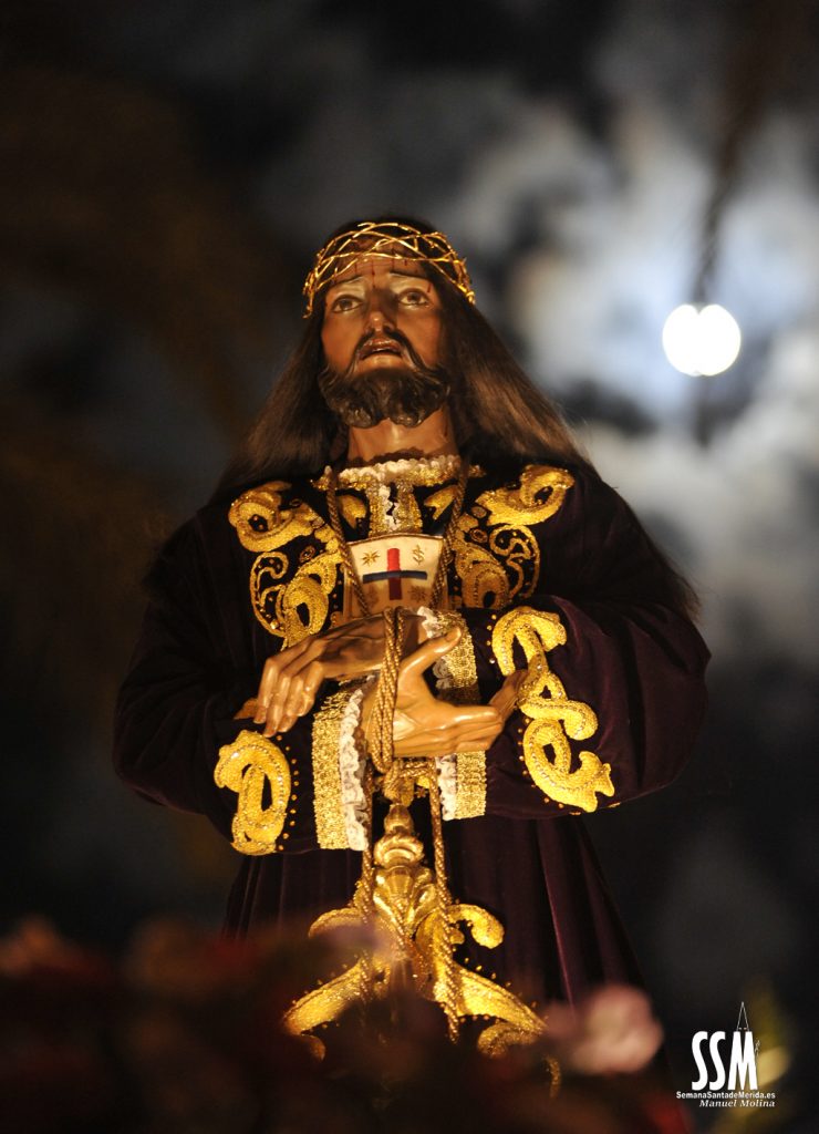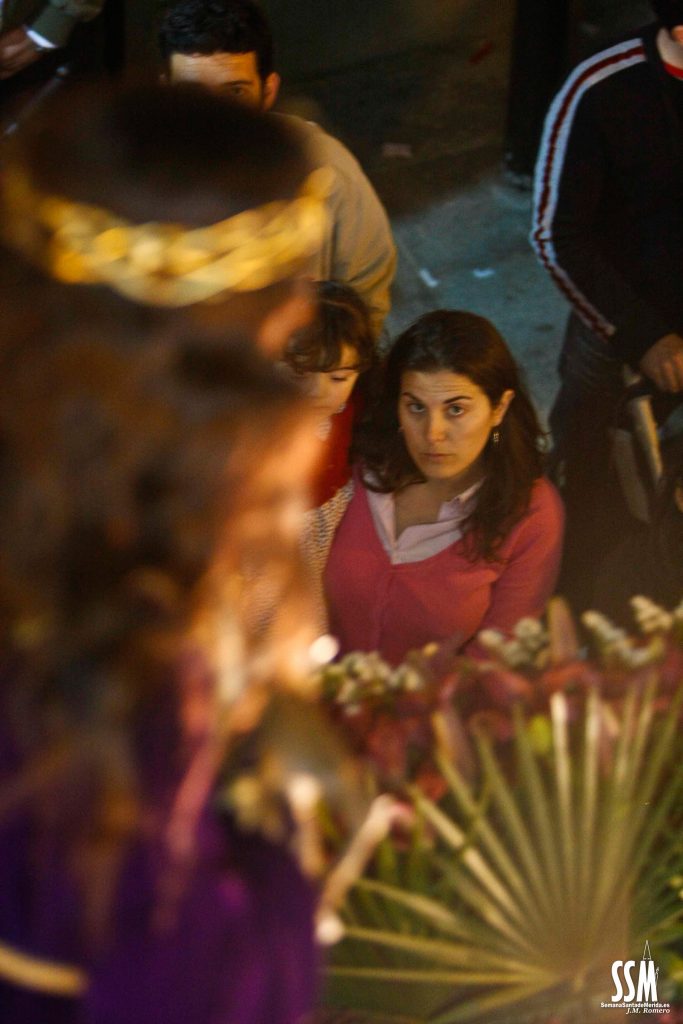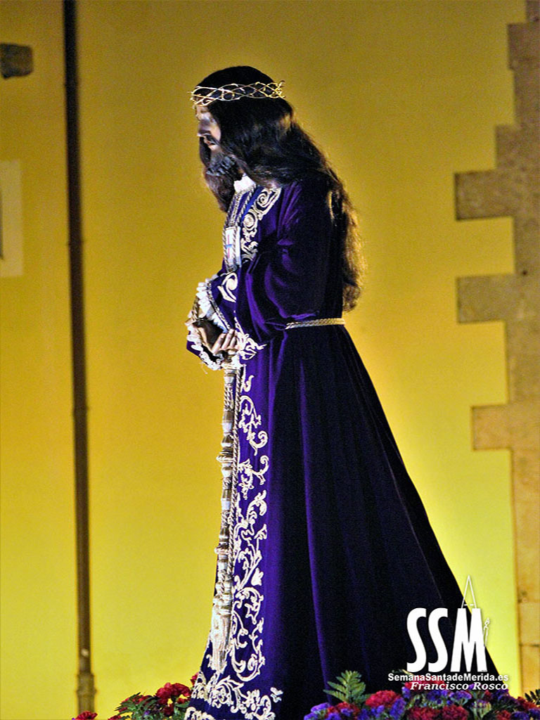 Asoma con saya burdeos sujetando una caña entre sus manos amarradas. La mirada perdida en el cielo que se torna gris y en su cuerpo, las señales de los tormentos padecidos. Injurias. Sufrimiento que inunda la angosta calle Concepción, para entrar en el tramo del silencio por las personas con diversidad funcional, personas con trastorno del espectro autista o con hipersensibilidad acústica. El destino ha querido que el silencio se haga eterno esta Semana Santa.