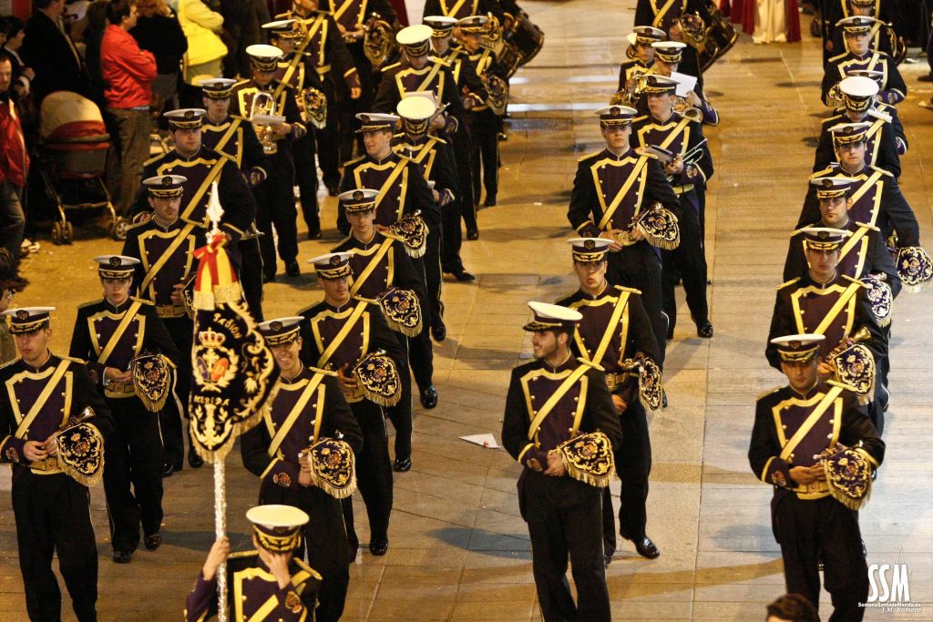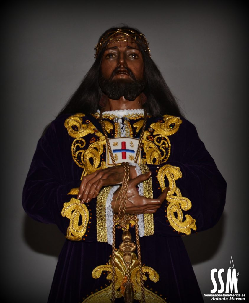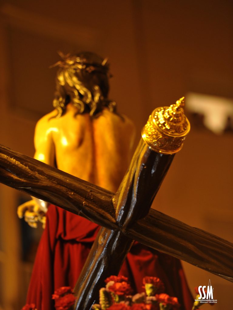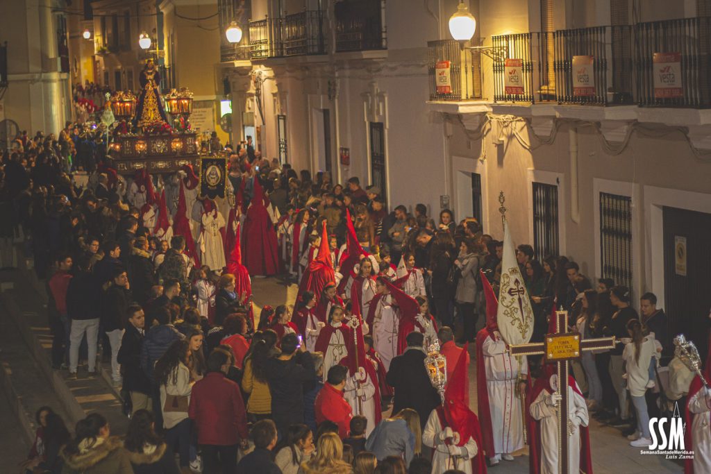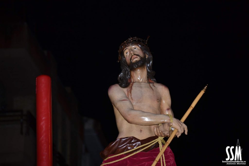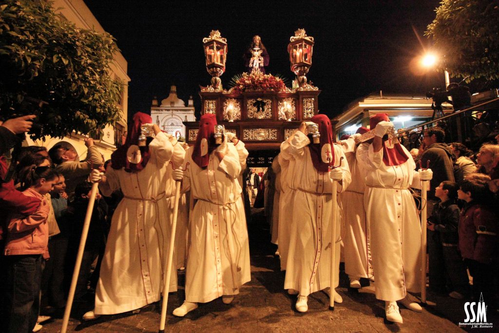Asoma con saya burdeos sujetando una caña entre sus manos amarradas. La mirada perdida en el cielo que se torna gris y en su cuerpo, las señales de los tormentos padecidos. Injurias. Sufrimiento que inunda la angosta calle Concepción, para entrar en el tramo del silencio por las personas con diversidad funcional, personas con trastorno del espectro autista o con hipersensibilidad acústica. El destino ha querido que el silencio se haga eterno esta Semana Santa.