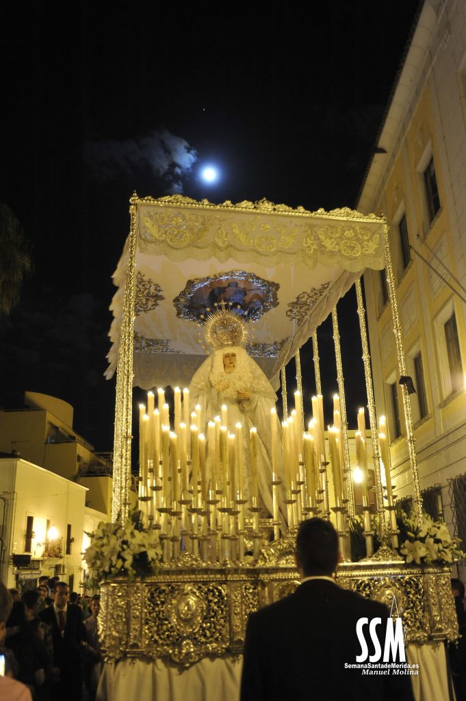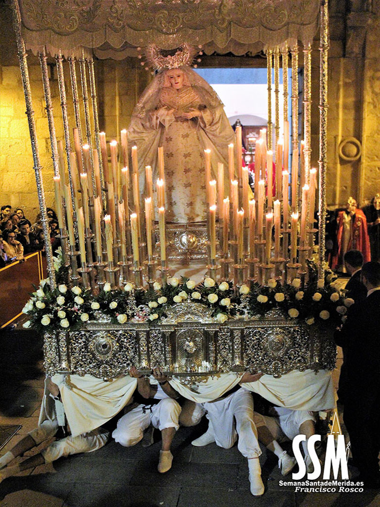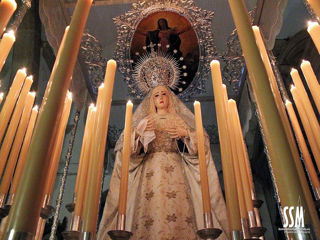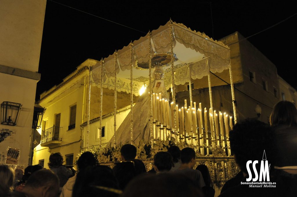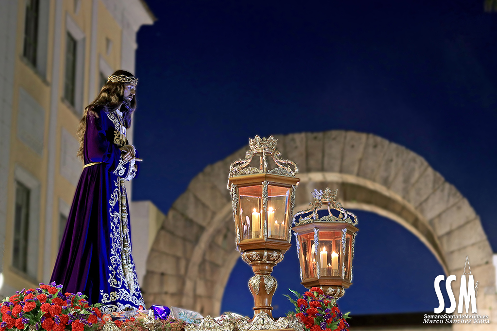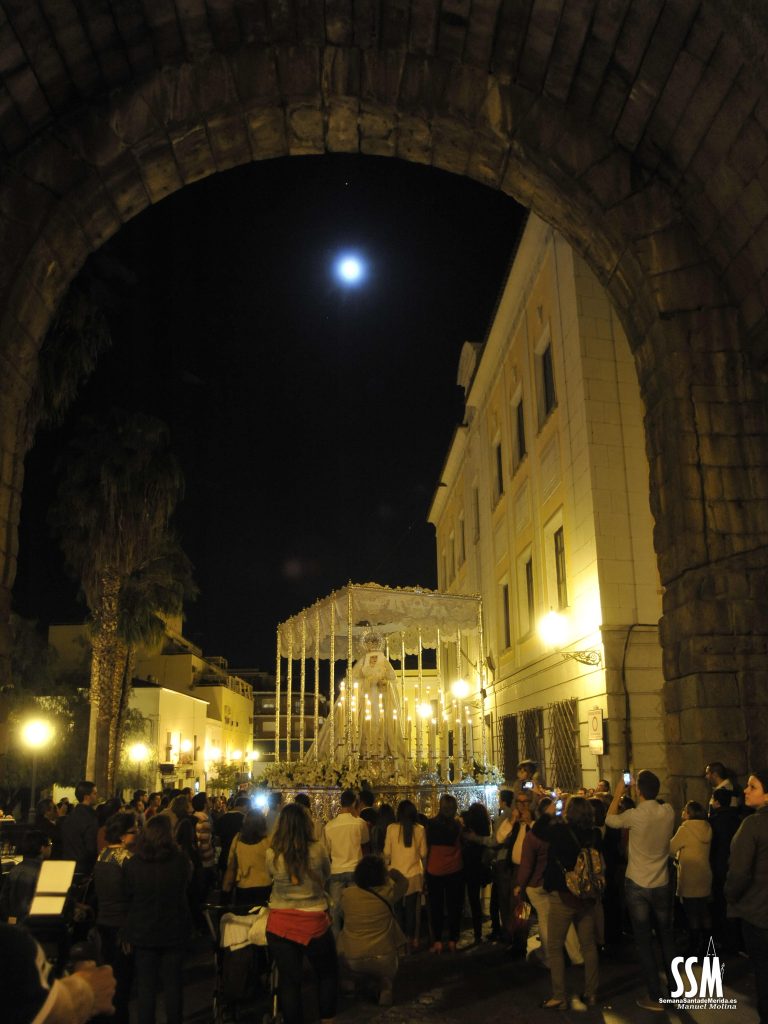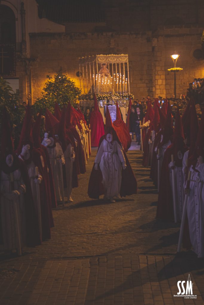 El rostro iluminado de la dolorosa se puede contemplar por Romero Leal. La madre de los infantiles es capaz de dejarnos enmudecidos a su paso y, aunque este tramo sea de los últimos, la Hermandad siempre llega a este punto más entera que nunca. Continúa el silencio pero en nuestra cabeza, este silencio hace más ruido que nunca. Baja meciéndose, de forma sencilla y sin estridencias hasta volver a la Plaza para concluir el camino.