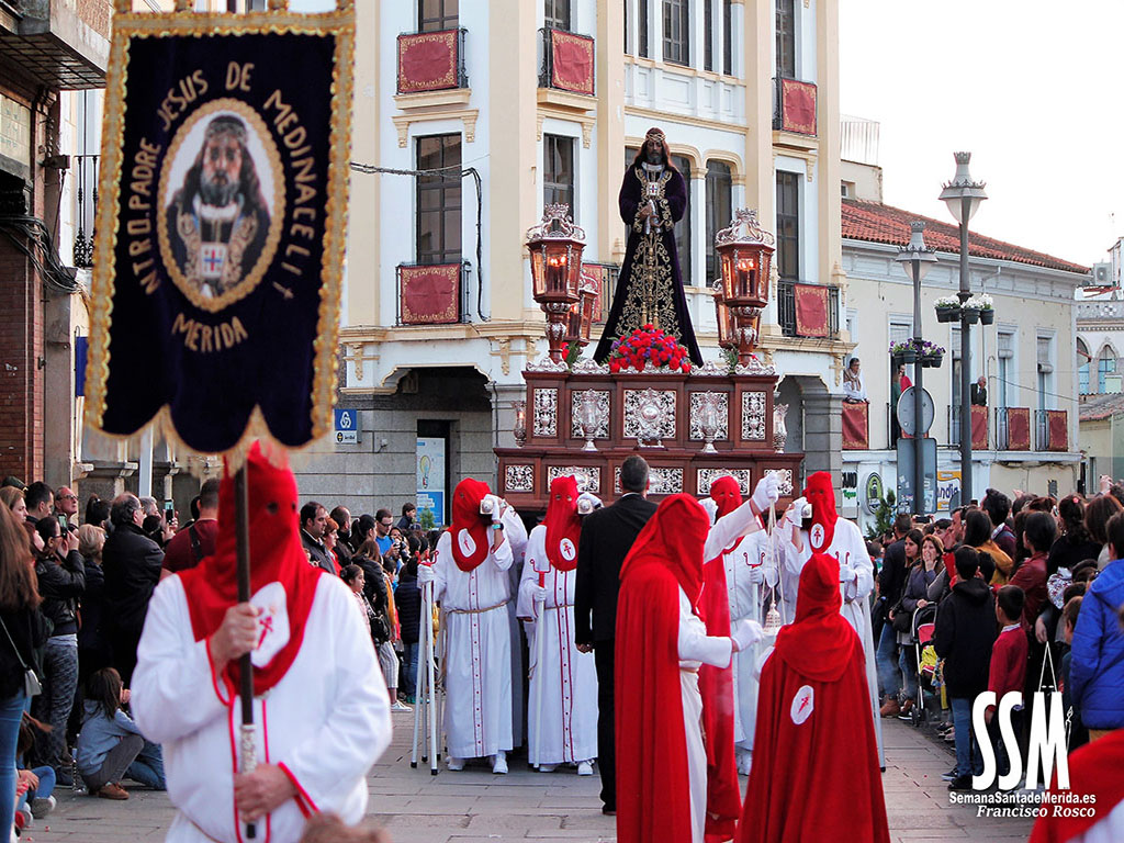 De pie, con las manos atadas y el gesto sumiso, se abre camino con la mirada serena y avanza escoltado por cuatro faroles. Podríamos estar hablando de nosotros, ahora, pero el recuerdo de su sombra en la fachada de la Concadetral vuelve a meternos de lleno en este ritual costumbrista de Lunes Santo con el majestuoso Cristo de Medinaceli.