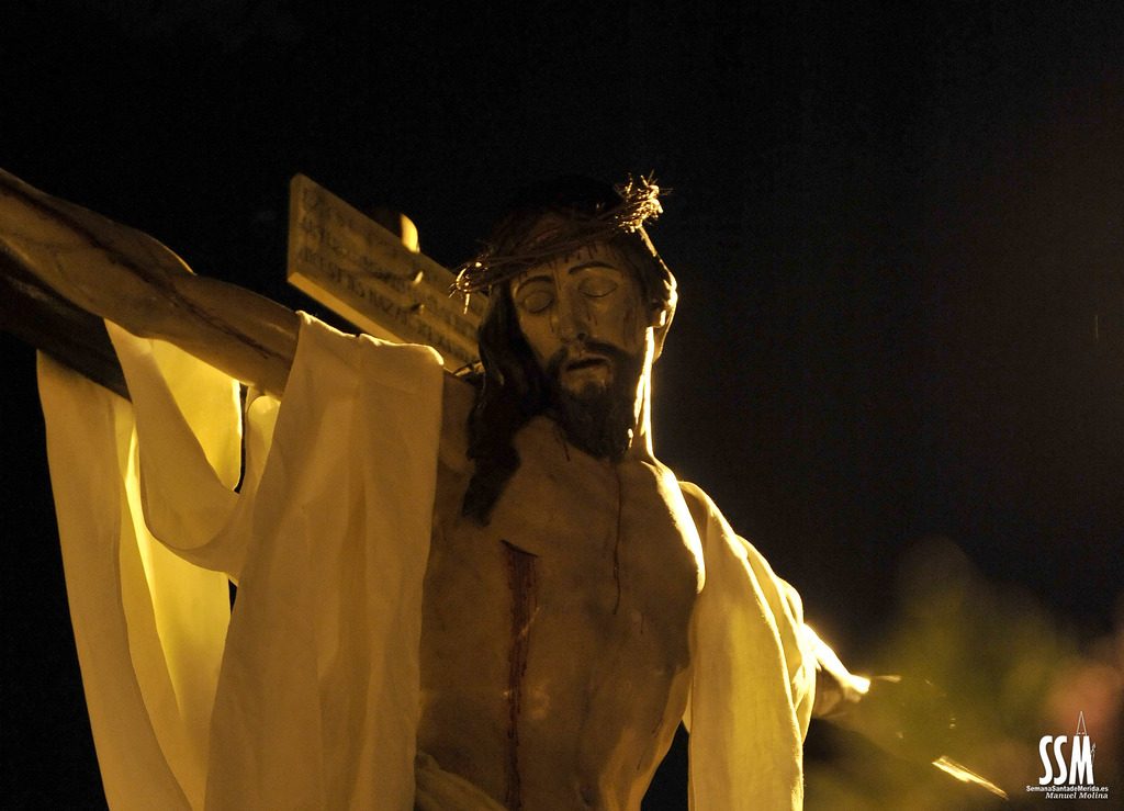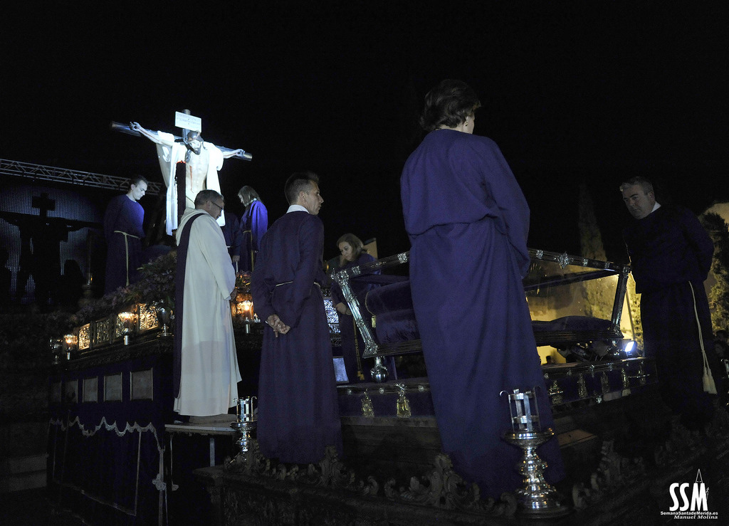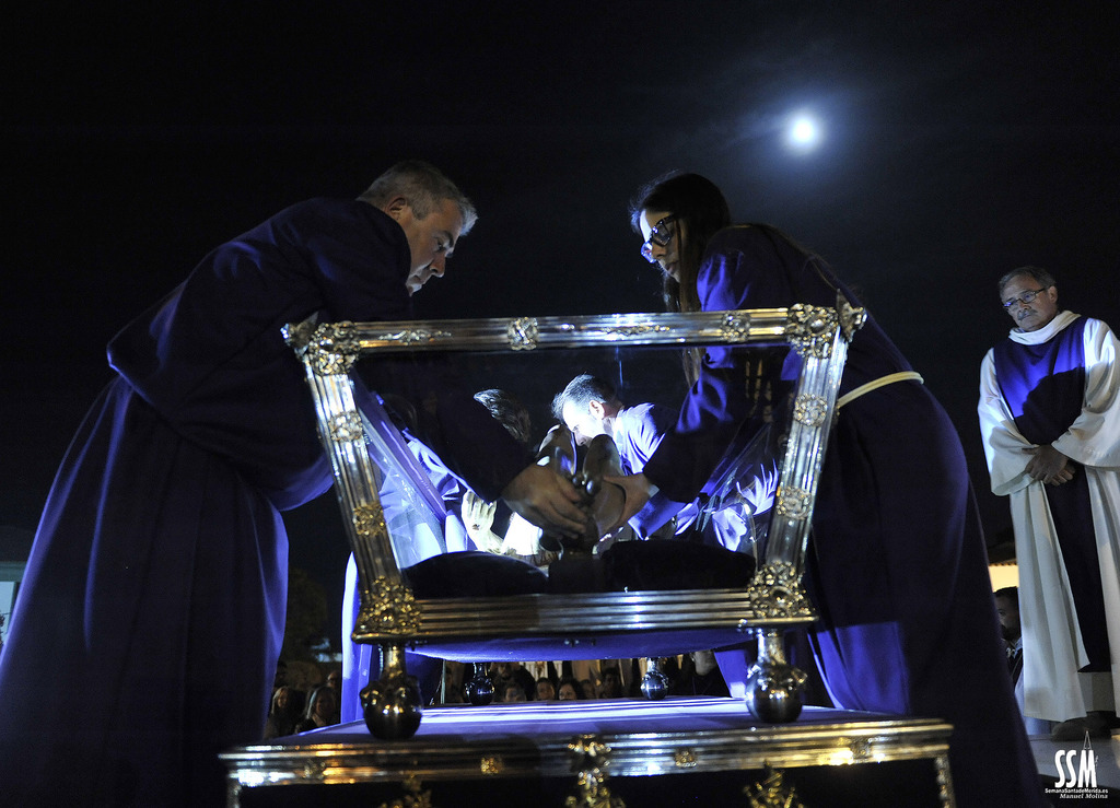 La luz ilumina la imagen de Cristo y hacia ella se dirigen un grupo de “nuevos discípulos” de José de Arimatea, que se disponen a bajar a Jesús de su trono de cruz. Lentamente van retirando de su cabeza la corona de espinas con la que lo coronaron como Rey de los judíos, y los clavos, ¡dulces clavos! con los que lo amarraron al madero. Los brazos de Cristo, antes tendidos sobre el regazo de su cruz, son sostenidos con dulzura y su cuerpo lentamente descendido, mientras nuevos canticos mozárabes resuenan en el silencio de la noche.