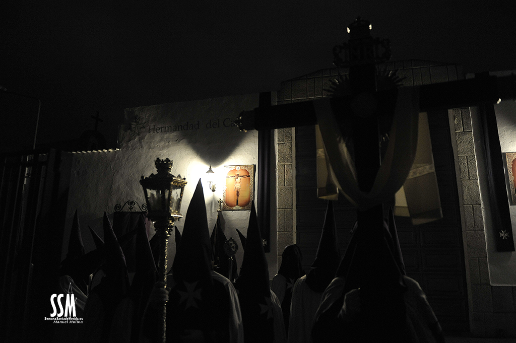 La oscuridad, solo rota por el tenue reflejo de la luna sobre las blancas capas de los nazarenos, envuelve a quienes acompañan al Cristo del Calvario, y su luz provoca un hermoso juego de sombras sobre las fachadas de las casas de este rincón de la ciudad, humilde y profundamente cofrade.