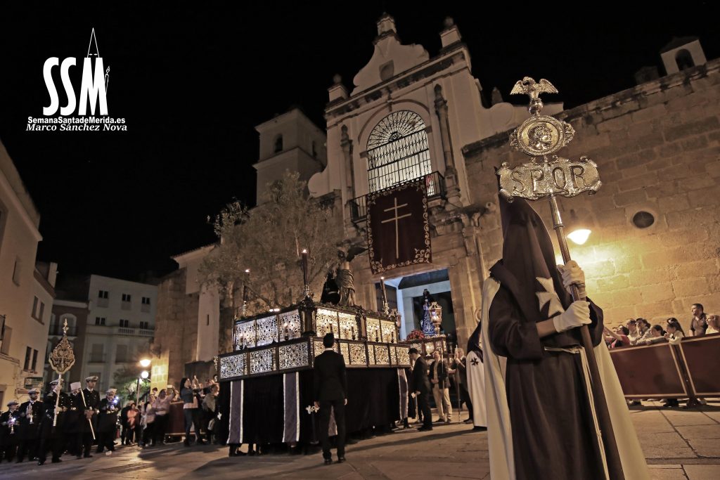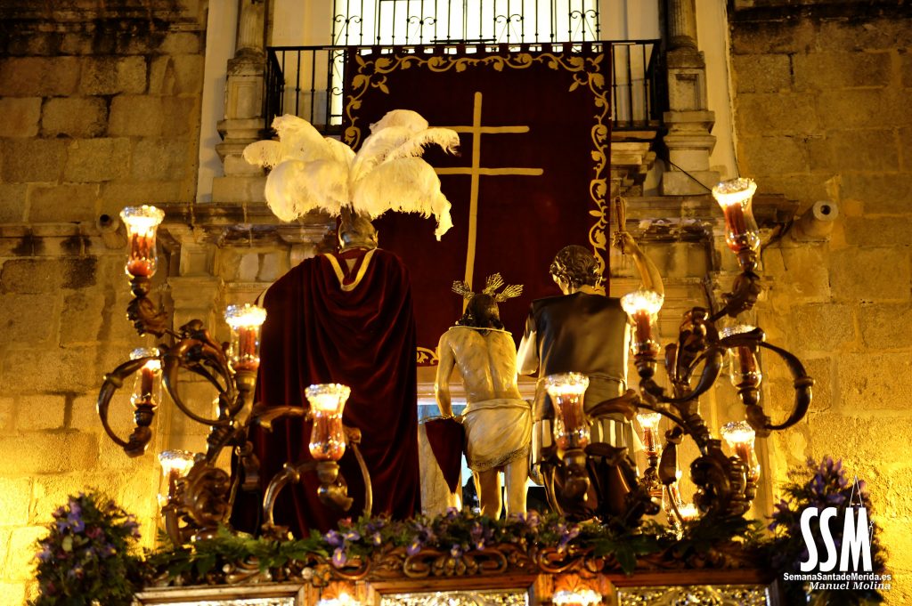 El Angel acompaña a Cristo en su oración, al igual que lo hacen todos los allí presentes, que, siguiendo los deseos de Jesús se mantendrán en vela, acompañándole en ese doloroso trance en el que siente su soledad y acepta la voluntad del Padre. Los costaleros levantan el remodelado paso y siguiendo los compases de la Agrupación Musical de Jerez de los Caballeros y las ordenes de sus capataces se va alejando pausadamente de la Ermita, rodeado de nazarenos. Pero esta Catequesis sobre la Pasión continúa y la siguiente imagen nos recuerda como: