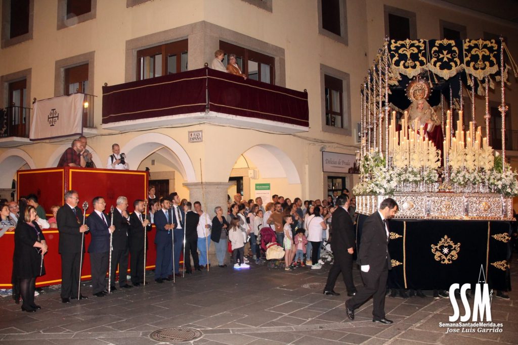 Y el “Nazareno del Calvario” avanza entre nosotros en silencio, un silencio solo roto por el racheo del sonido de los pies de los costaleros, que este año lo portan por primera vez, “a costal”, y que siguen las certeras instrucciones de sus capataces, haciendo que su caminar nos recuerde el duro camino de Jesús, bajo el peso de su cruz, o por mejor decir: de nuestra cruz, de la de cada uno de nosotros, que contemplamos sobrecogidos esta dolorosa, pero al mismo tiempo hermosa imagen de Manuel Pineda Calderón. Y tras Jesús marcha su Madre, María Santísima de la Amargura, que bajo el palio sigue los pasos de su hijo. En su bello rostro refleja el dolor de una madre que ve como le van a arrebatar a su hijo, y en su caminar va recibiendo continuas muestras de cariño de las buenas gentes del Barrio, que le dirigen piropos, como queriendo hacer menos dolorosa su Amargura. La Banda Sinfónica de Pozoblanco interpreta la marcha “Legum servi”, compuesta por un hermano de esta Cofradía, y la imagen de Virgen de la Amargura, inicia su caminar por las calles de su Barrio.