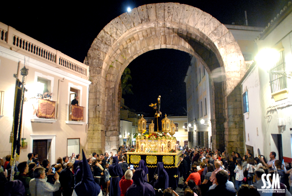 Caminar en el que se suceden momentos entrañables como el paso la puerta de la Parroquia de Cristo Rey, en la que su coro de dirige una sentida canción, y sobre todo su paso por el callejón que lleva su nombre, esencia de este Martes Santo: el callejón de la Amargura, en la que su palio se detiene unos instantes para recordar la pérdida de una hermana de la Cofradía, y en la que sus costaleros protagonizan una nueva “levantá” llena de sentimientos. La procesión abandona el Barrio y dirige sus pasos hacia la Concatedral de Santa María, y una vez allí, lentamente, cada uno de los cuatro pasos irá realizando un breve encuentro, ante la imagen de Jesús de Medinaceli, que, situado bajo el dintel de su puerta, nos recibe. Subiendo por Santa Julia nos dirigimos hacia el Arco de Trajano, y en él se producirá una de las imágenes más bellas de esta estación de penitencia. El discurrir de cada uno de los pasos bajo el Arco, recortando su silueta con el fondo de un cielo iluminado por la luna llena de Pascua, es una imagen que será difícil de olvidar. Y allí vivimos otro momento lleno de sentimiento y emoción, el detalle de un joven capataz de la Virgen de la Amargura, que ofrece a su padre el martillo, para que esa mano que le llevo a ver de pequeño esas procesiones, en las que se poco a poco se hizo cofrade, sea quien ordene esa “levantá”, y de como padre e hijo se funden en un abrazo, que simboliza el relevo, la continua renovación de esta Semana Santa emeritense que es única, y que cada año se engrandece y mejora, como lo hace cada año esta Hermandad y Cofradía del Calvario.