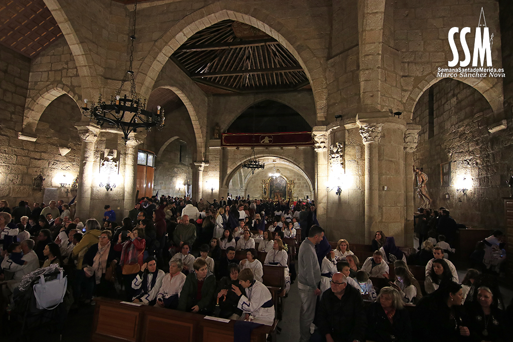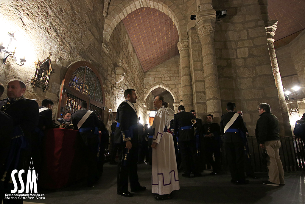 Para entonces, Tres Caídas ya había aplazado su salida a la espera de mejores nuevas climatológicas. La Puerta de la Villa ya acogía a los primeros fieles deseosos de dolerse junto a Nuestra señora del Mayor Dolor y al pie de la cruz del Nazareno. La avenida de Extremadura y el atrio se llenaban de paraguas. En él, a pesar de la lluvia, los nazarenos mostraban sus ansias; las mantillas cruzaban las manos y entornaban los ojos envueltas en una plegaria, los costaleros miraban al cielo. Y dentro de la Basílica…
