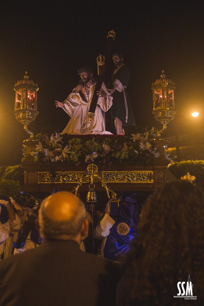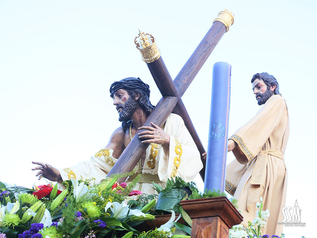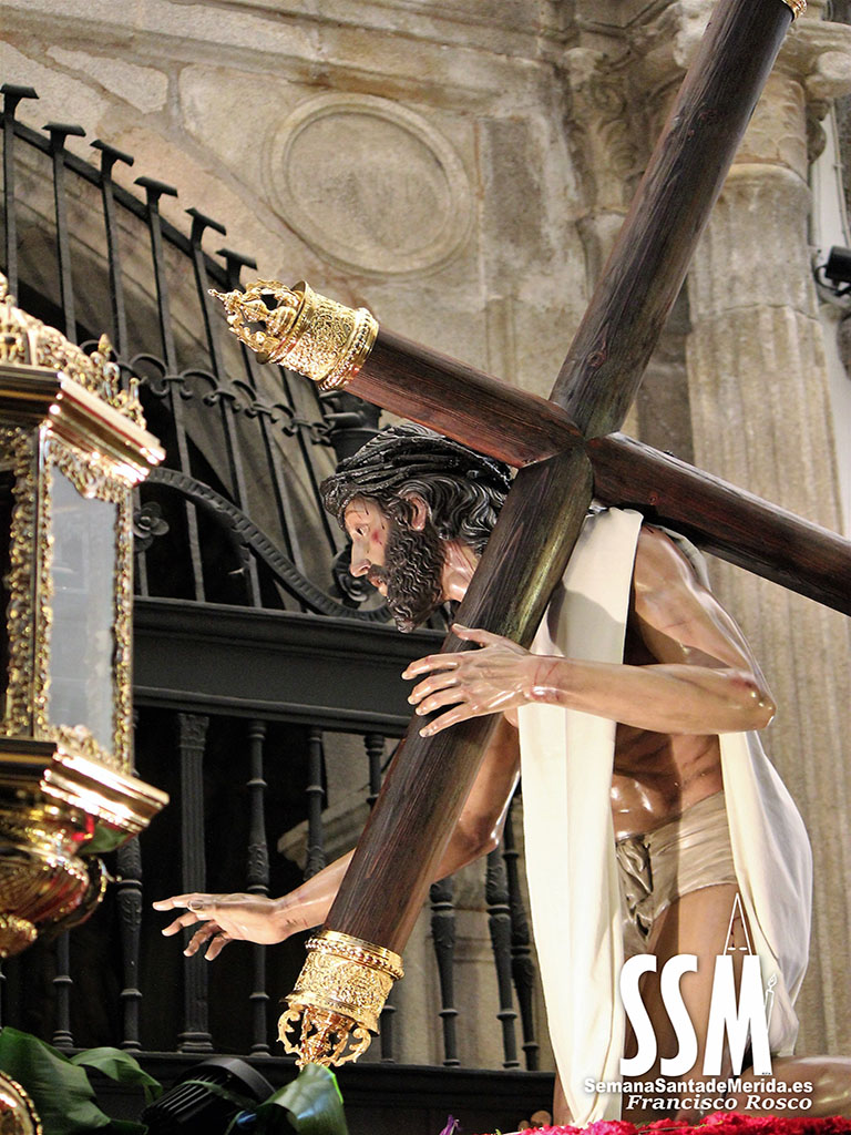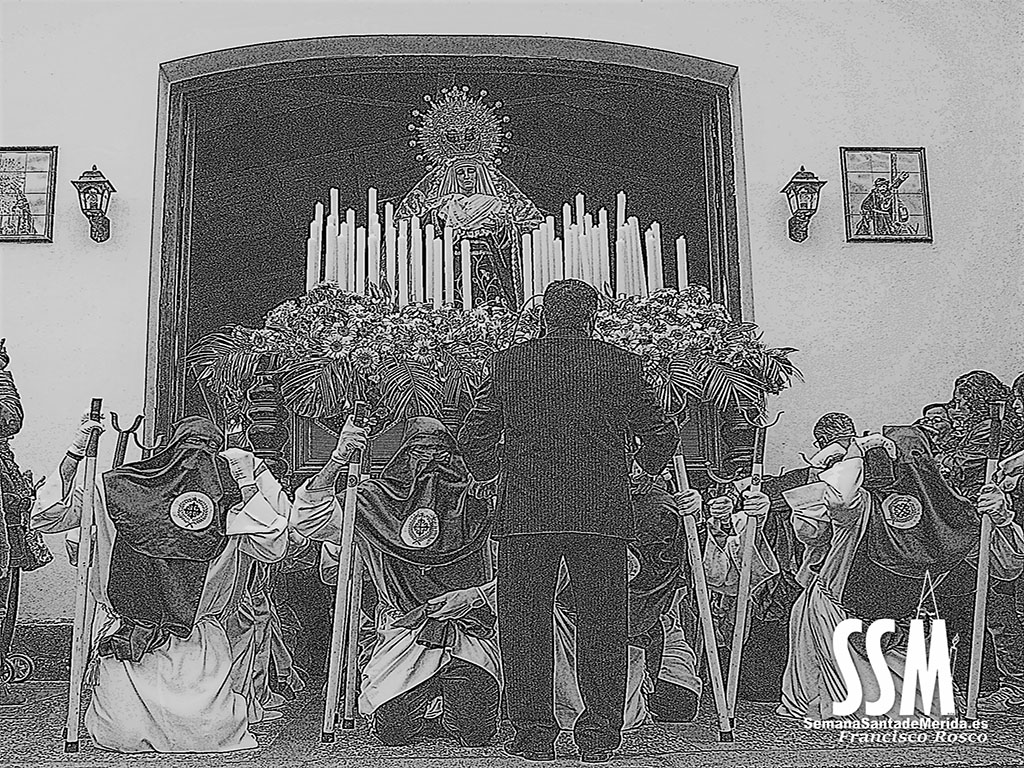 Lentamente, gira su cuerpo. Levanta la cabeza. Sus ojos, llenos de lágrimas, se fijan en un punto. Allí, al final de esa misma avenida. El Cristo de las Tres Caídas y Nuestra Señora de la Misericordia se han cuadrado ante la puerta acristalada enmarcada en columnas de colores y un gran voladizo verde. Apenas reciben la luz que llega de las ventanas. Pero con Ellos llega la Oración y la Luz.