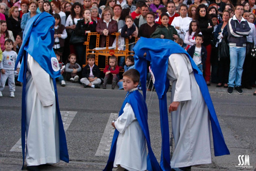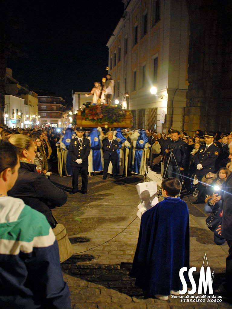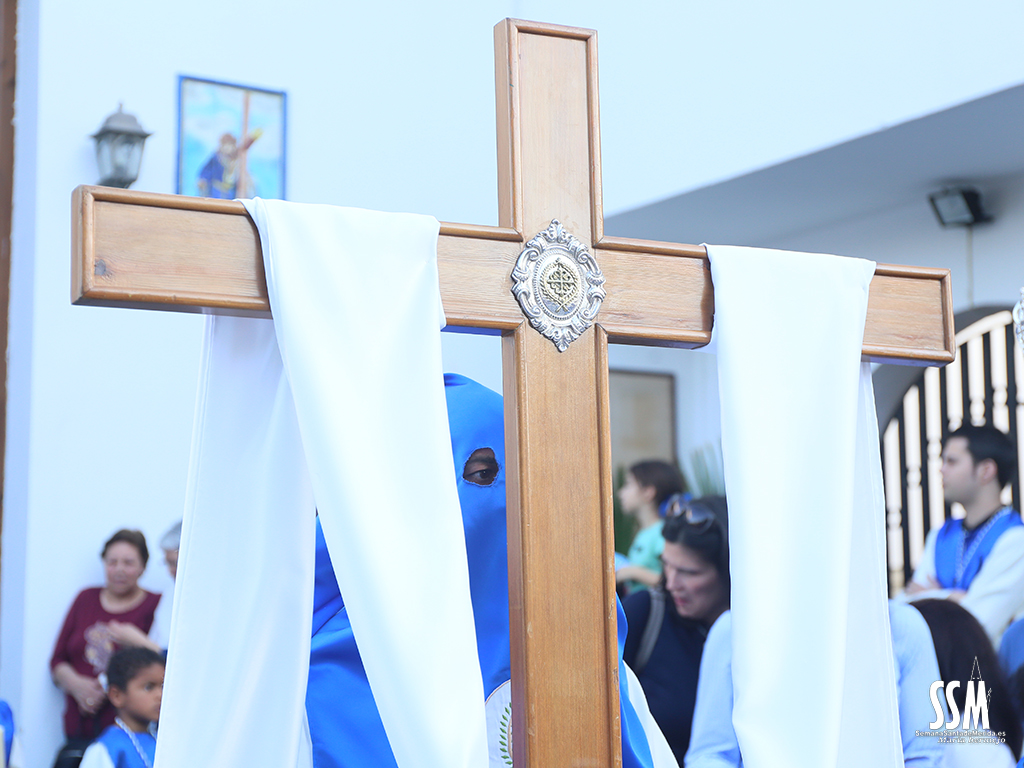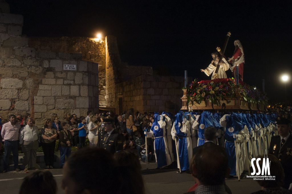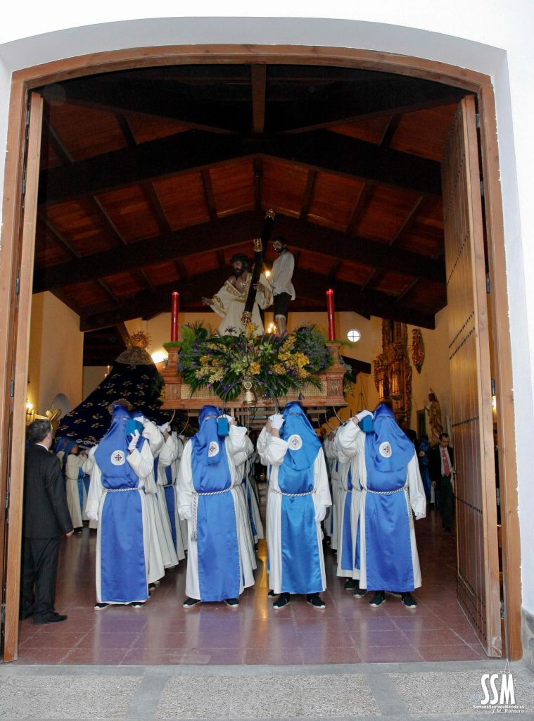 Son las ocho de la tarde y la algarabía estalla en balcones. Suenan palmas, La Saeta y las sirenas de las patrullas del Cuerpo Nacional de Policía. Son Hermanos de Honor de la Cofradía y no van a faltar a su cita anual con el imponente Caído de Berlanga y la soberana solemnidad tranquila –cual mar azul como su manto- de la Virgen de la Misericordia.