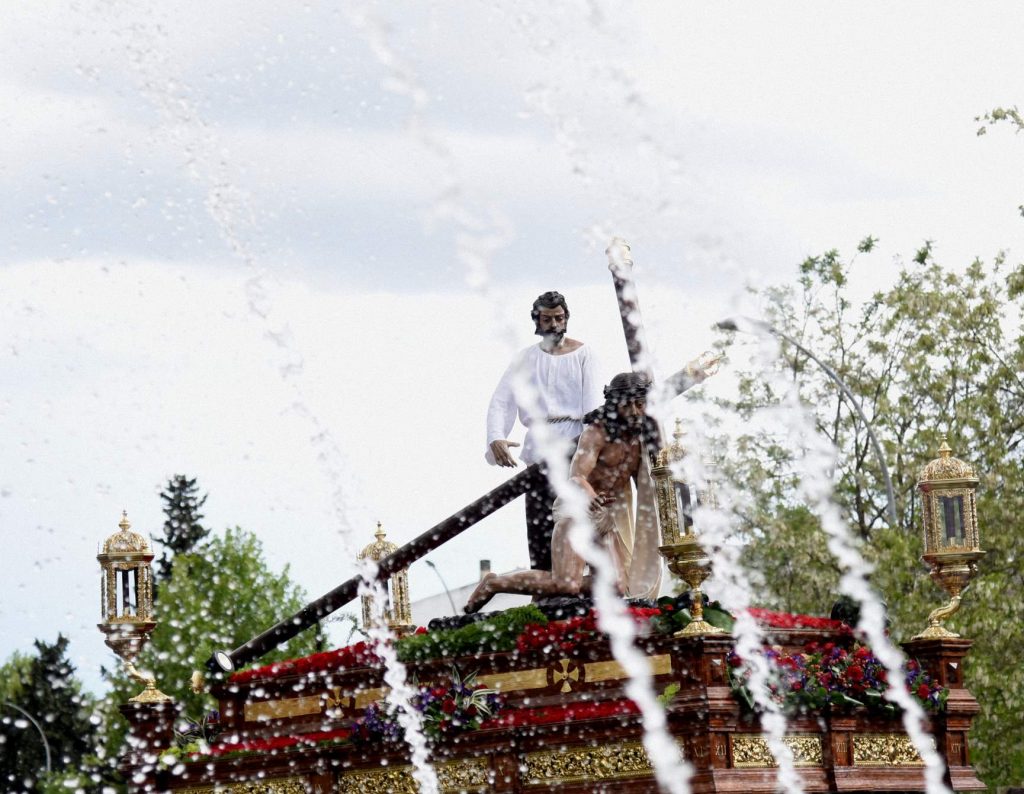 Sólo las imágenes del Cristo de las Tres Caídas y Nuestra Señora de la Misericordia, suspendidas en los balcones aledaños, denotan que estamos en Miércoles Santo.