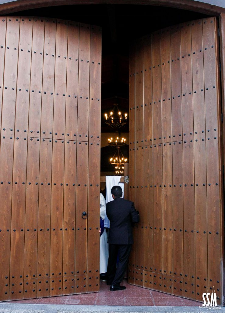Un vecino, quizás buscando el momento a propósito, ha bajado la basura justo cuando el silencio ha vuelto a hacerse dueño del lugar. Mira a las monumentales puertas por dónde sale la Hermandad y se fija en los azulejos que, con la imagen de los titulares, en sendos lados las flanquean. Reflexiona.