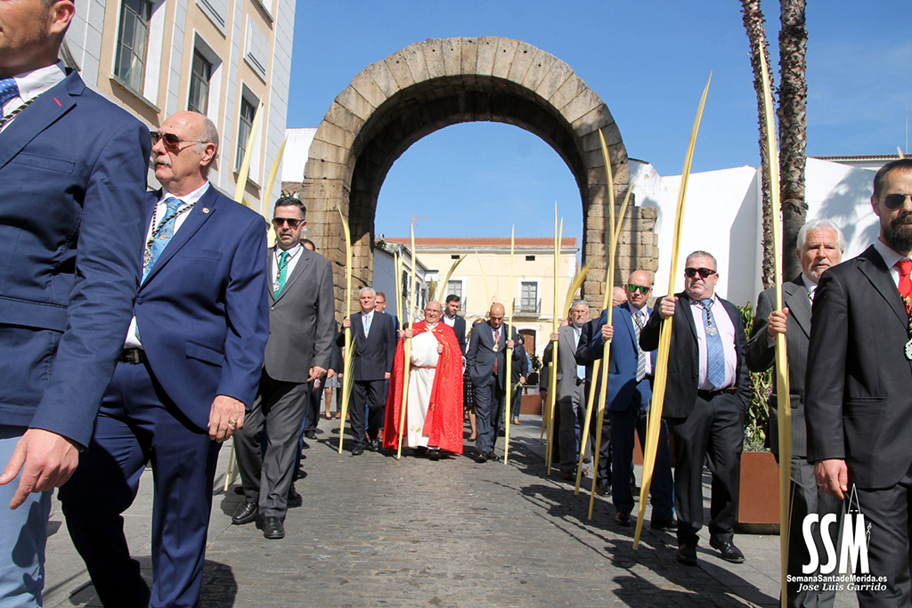 Mérida, junto a las autoridades municipales y la Junta de Cofradías se dispone a acompañar a Jesucristo en su entrada a la Ciudad Santa, a rememorar la tradición que realizaron, cada Domingo de Ramos, nuestros antepasados. No hay paso, ni costaleros, solo el párroco de Santa María que, en el centro del cortejo, avanza escoltado por el Hermano Mayor de la Cofradía Infantil y el presidente de la Junta de Cofradías mientras suenan las primeras notas de las marchas que acompañarán a nuestros pasos durante toda la Semana.