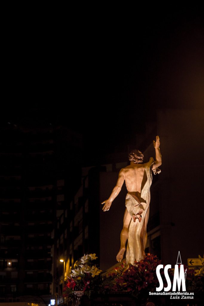 Y así es, nada más pasar la noche los fuegos de artificio anuncian que Cristo ha vuelto a la vida, que nuestros pecados son perdonados, que una nueva vida nos inunda a todos desde lo más profundo de nuestros corazones. Así, Jesús Resucitado se convierte en el principal protagonista de la noche, avanzando por la avenida seguido el ferroviario San Juan Evangelista, el discípulo amado que le acompaña en busca de su madre en la Puerta de la Villa.