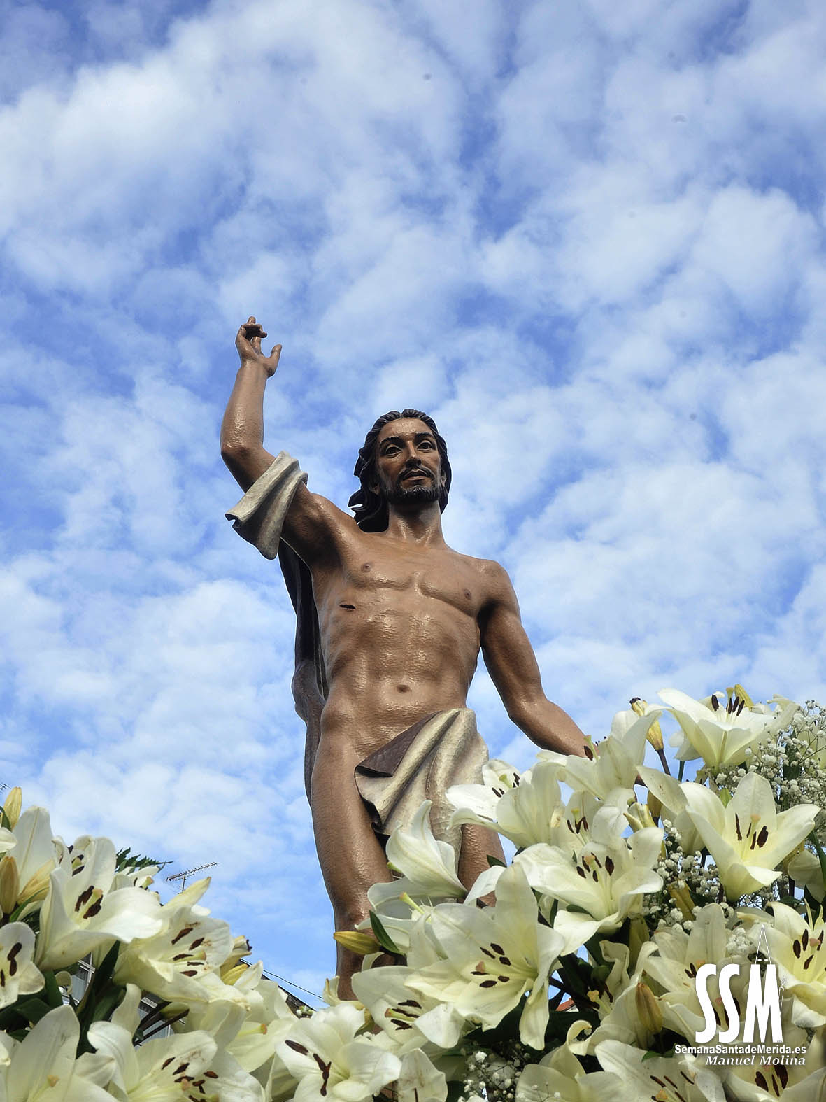 Mañana luminosa en la que la ciudad despertó, definitivamente, con el estruendo de los fuegos artificiales que anunciaban la salida del Resucitado a plena luz del día. De esta manera, la procesión se bifurcó buscando la Puerta de la Villa donde numeroso público esperaba el esperado encuentro entre Nuestro Señora del Mayor Dolor, vestida de blanco y con un exorno de lilium en tonos rosas en el frente y rosas rojas en los laterales y Jesús Resucitado exornado con lilium blanco, y que llegó acompañado por la Junta de Cofradías. Todo elll en presencia de San Juan, el joven ferroviario, que gritó a los cuatro vientos ¡Aleluya! Desplegando su mensaje sobre gerveras.