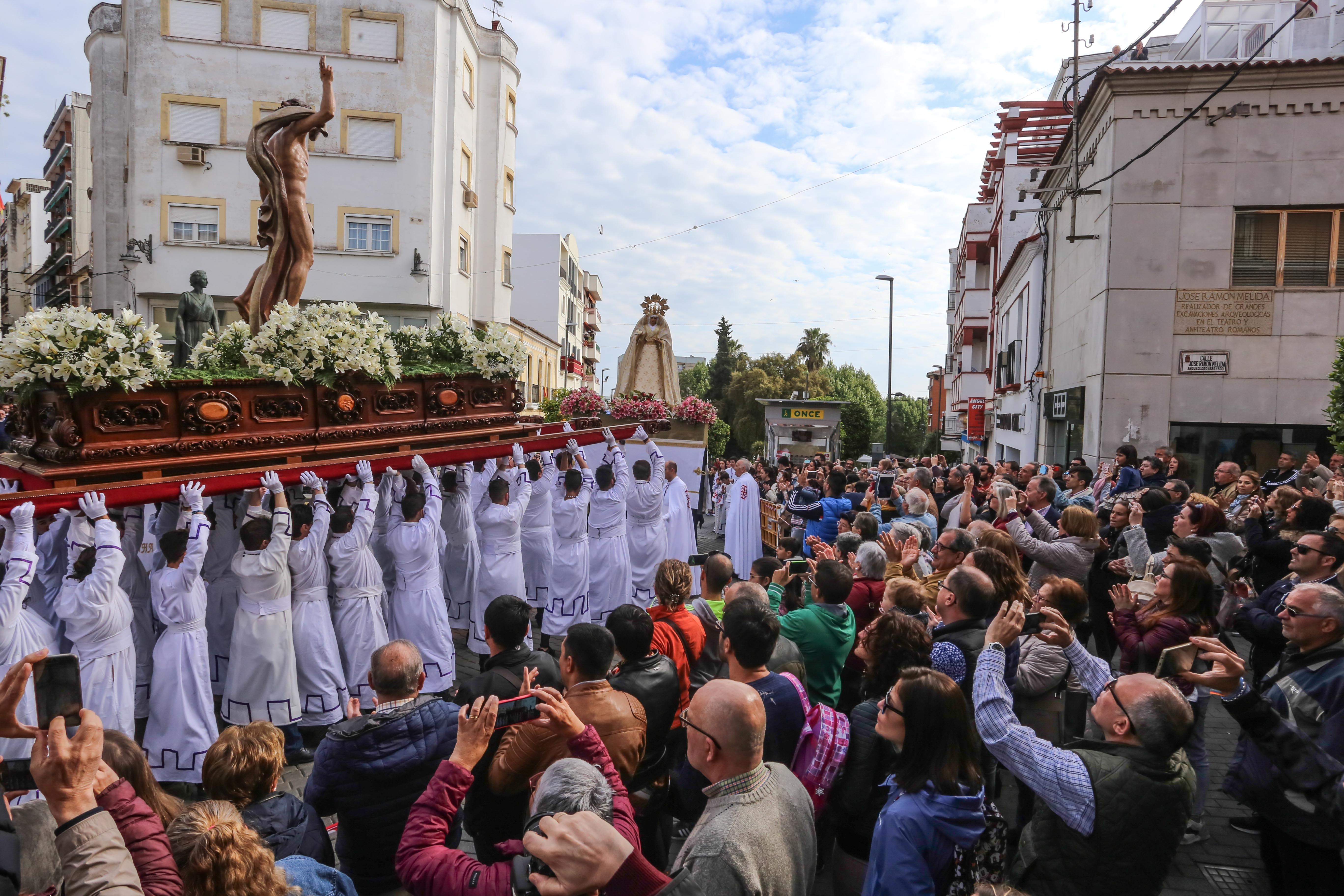 Mañana luminosa en la que la ciudad despertó, definitivamente, con el estruendo de los fuegos artificiales que anunciaban la salida del Resucitado a plena luz del día. De esta manera, la procesión se bifurcó buscando la Puerta de la Villa donde numeroso público esperaba el esperado encuentro entre Nuestro Señora del Mayor Dolor, vestida de blanco y con un exorno de lilium en tonos rosas en el frente y rosas rojas en los laterales y Jesús Resucitado exornado con lilium blanco, y que llegó acompañado por la Junta de Cofradías. Todo elll en presencia de San Juan, el joven ferroviario, que gritó a los cuatro vientos ¡Aleluya! Desplegando su mensaje sobre gerveras.