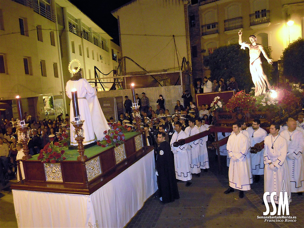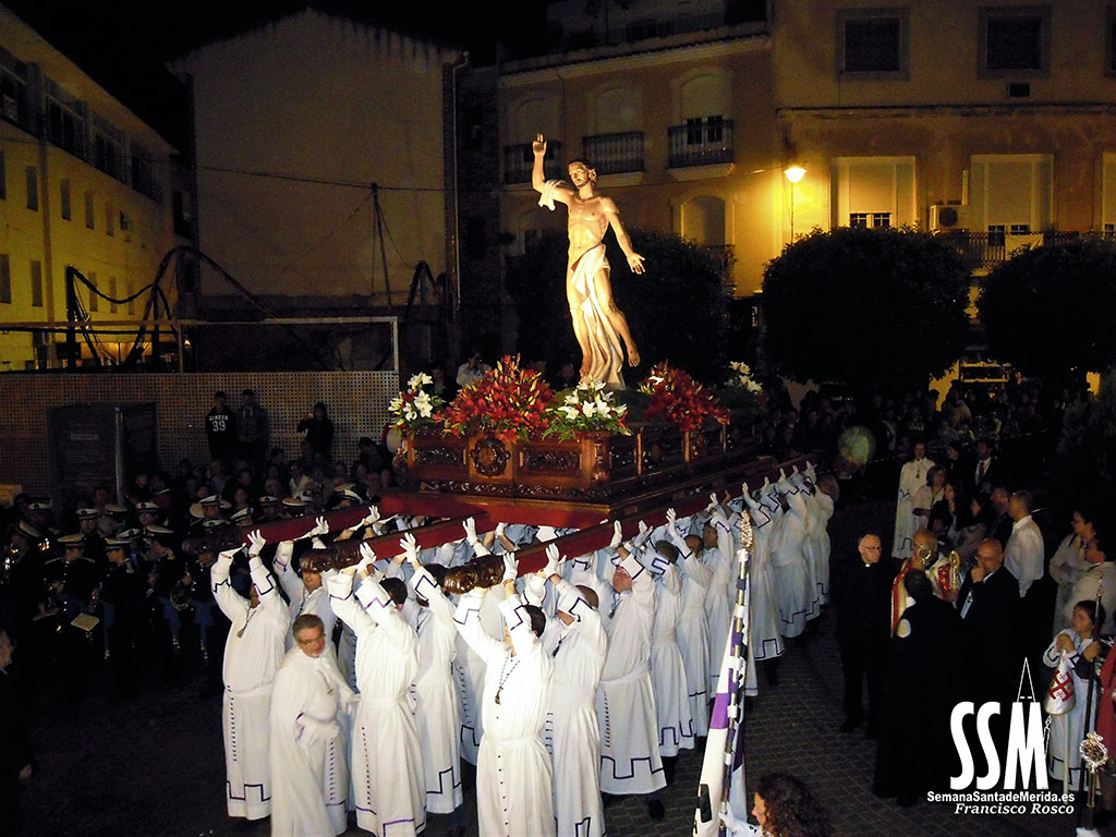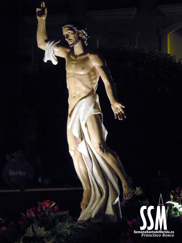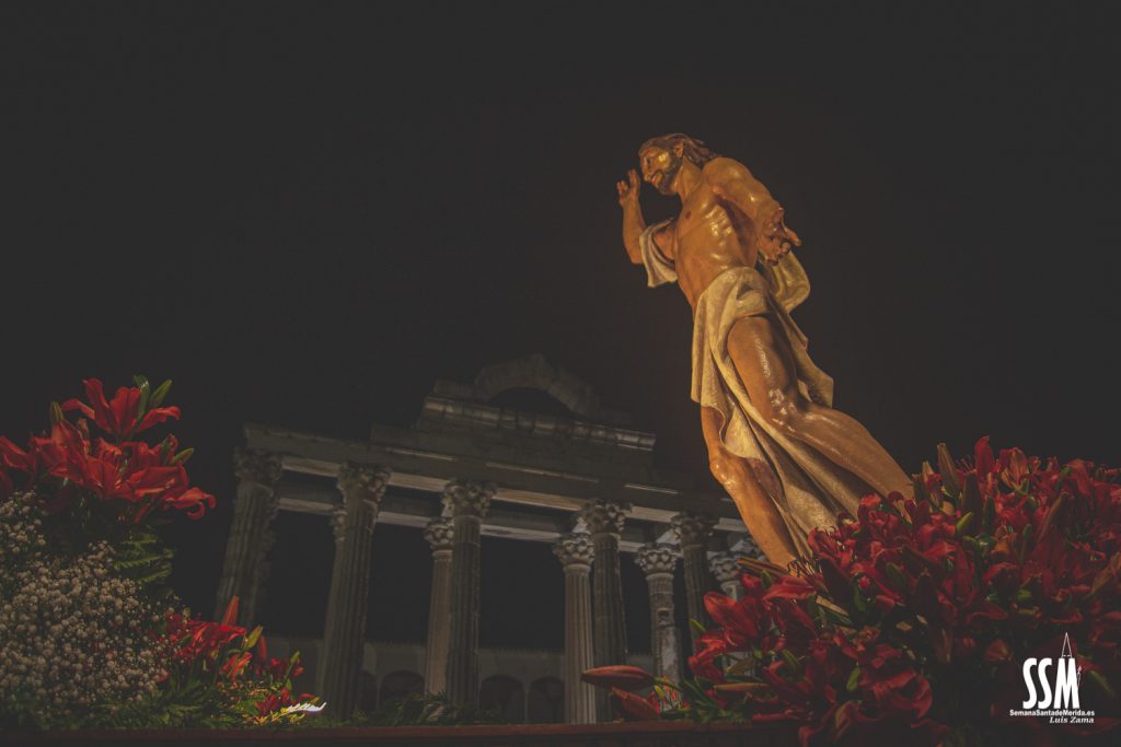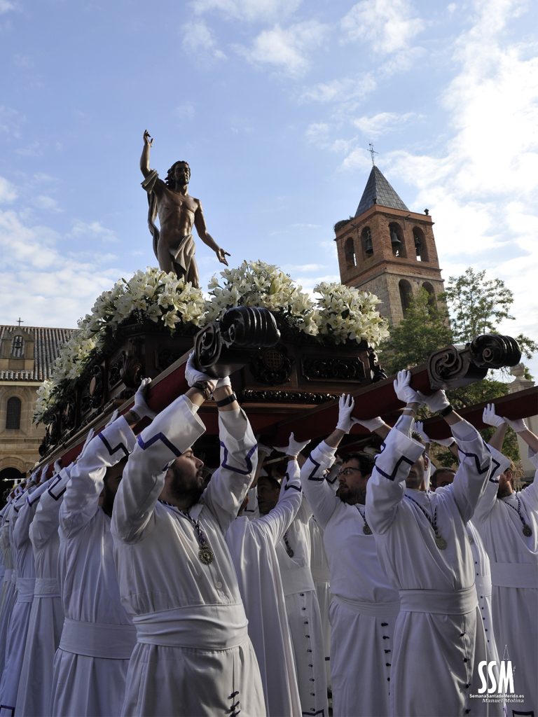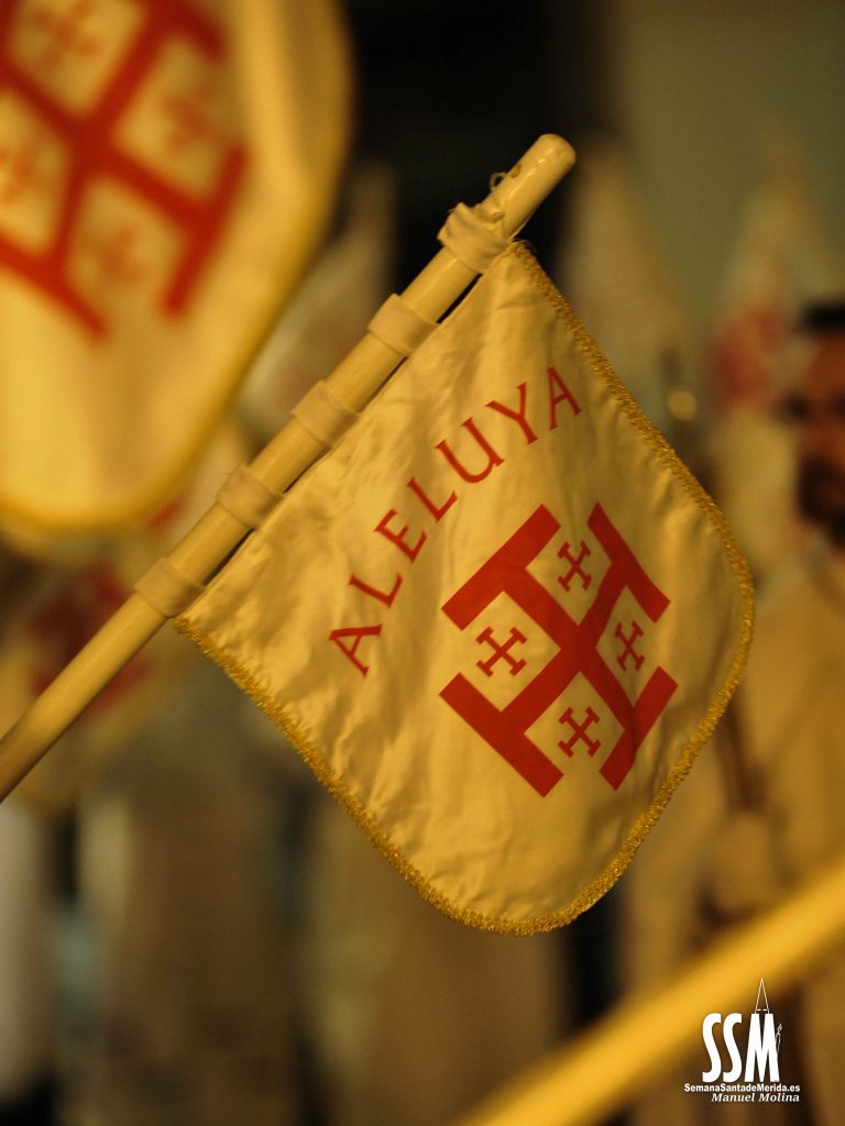El Domingo de Resurrección es la fusión de dos hermandades que se hacen una por las calles de Mérida. Y esa unión de alegría se ve cada año refrendada en los rostros de los miembros de las dos cofradías que, a cara descubierta, van promulgando por las calles de la capital extremeña la alegría y la exaltación que esculpió Zancada en su cristo.