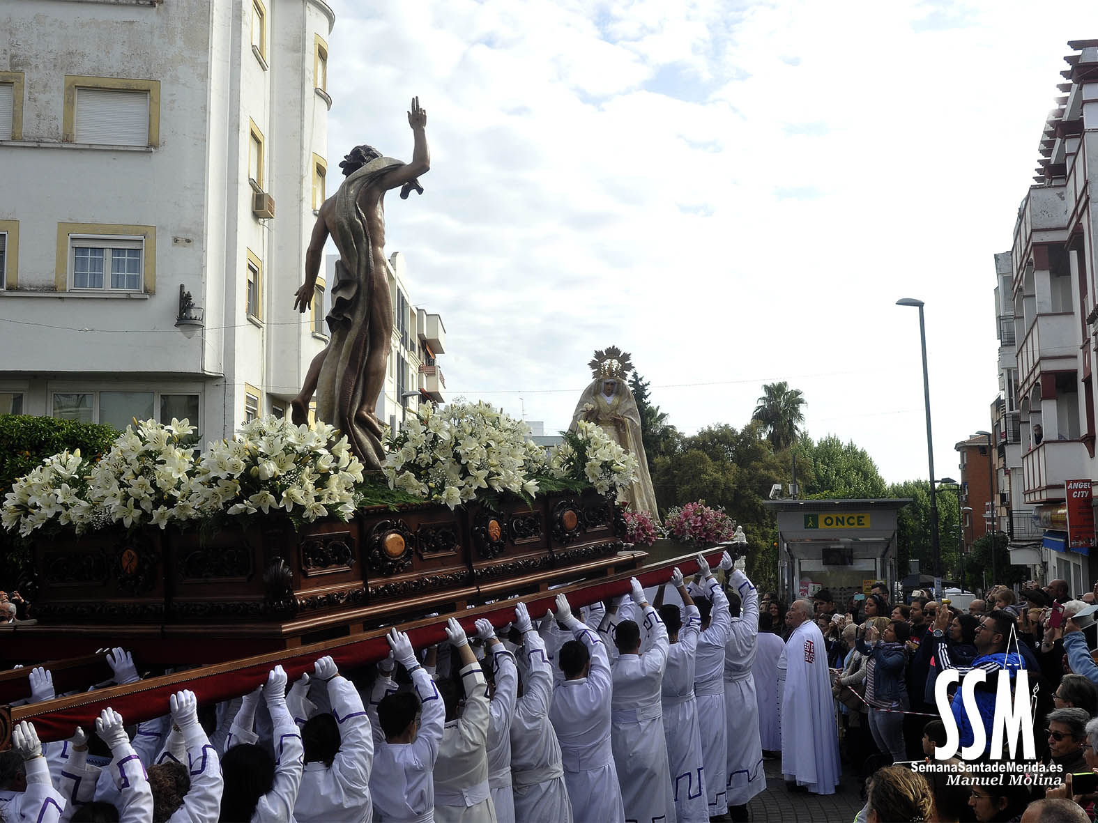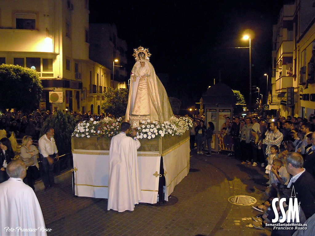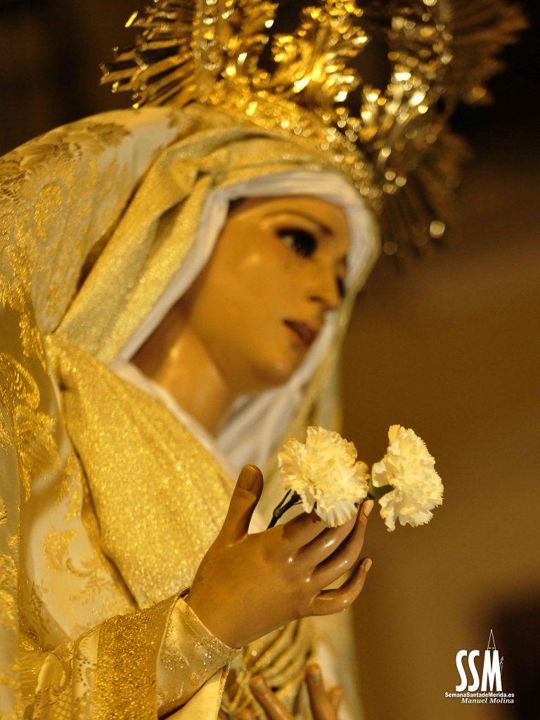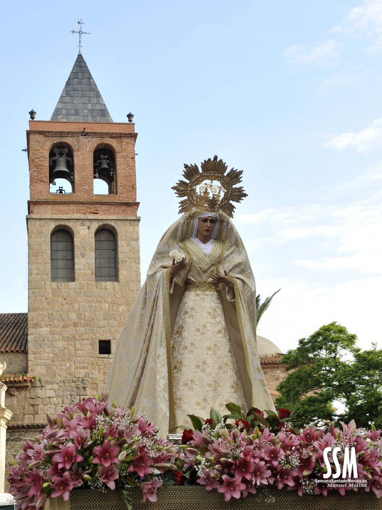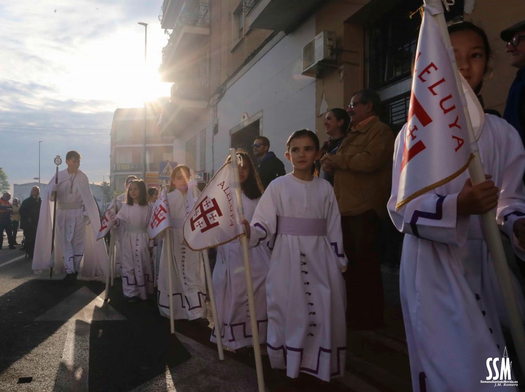 Con la misma tranquilidad y alegría portan sobre sus hombros los jóvenes del Resucitado, hoy son ellos los protagonistas. Y hacia el encuentro se dirige también el Mayor Dolor, por tercera vez en nuestra Semana Santa, pero con el peso más aliviado, el físico y el sentimental. Y así lo demuestra su cuadrilla que una vez más regala por las calles de Mérida chicotás que pasan a la historia personal de cada uno de los presentes. El drama del Mayor Dolor se torna en este Domingo de Resurrección en colores blancos, dorados y malvas. Y mucha luz, una luz que distibuye en cada rincón de la ciudad.