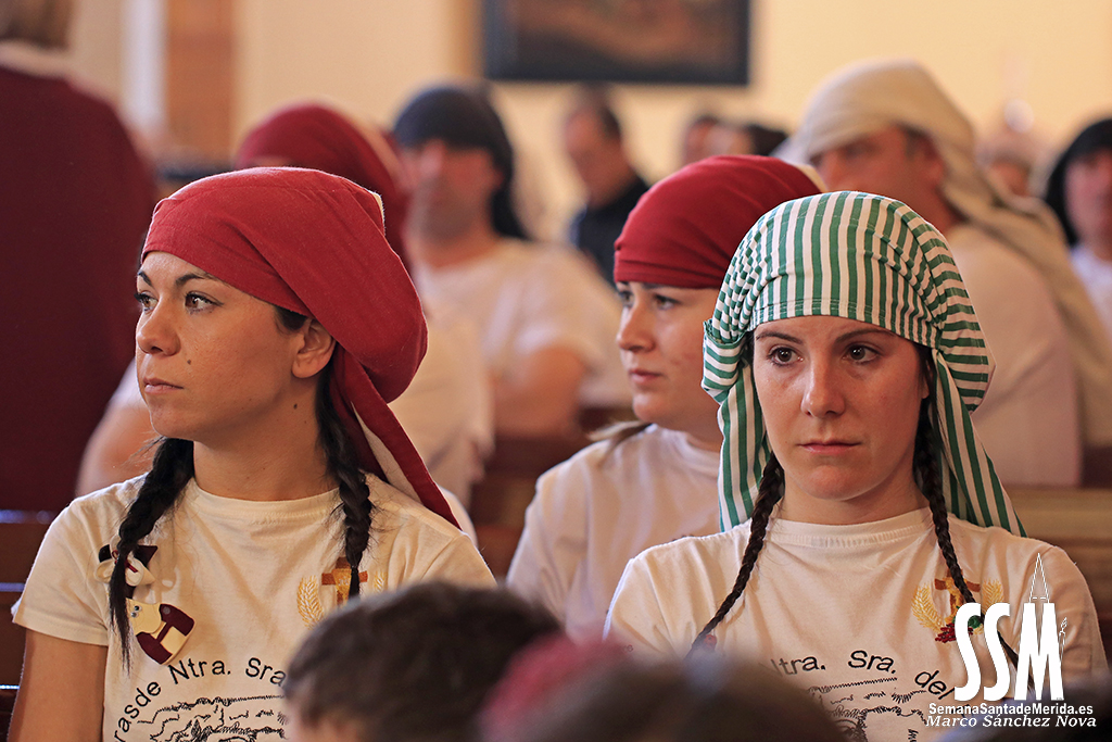La mañana se levantó desapacible. Con lluvia y cielos encapotados, pero el día se fue abriendo poco a poco. Sabiendo que la tarde era el momento del comienzo de la Semana Santa de Mérida y con ella el devenir de hermandades y cofradías que ponen en la calle sus pasiones. La primera de ella, como es habitual, llega desde la barriada de La Argentina. A las cinco de la tarde, puntuales, se abrió la gran puerta de la Casa Hermandad de la parroquia de San José para dar la bienvenida al imponente paso de la Sagrada Cena. Mucho público se concentraba en este momento de una cofradía que va creciendo con los años. Los primeros nazarenos, los más pequeñitos, con sus túnicas marfil y capas burdeos comenzaban a anunciar el comienzo de la Semana grande de la capital extremeña.