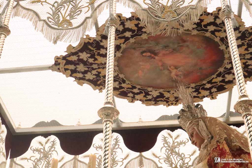 Se aproxima otro de los momentos singulares de esta estación de penitencia: su siempre impresionante paso por el Templo de Diana, entre preciosas chicotás. Primero avanza el «barco» de la Cena, y pasos más atrás, el palio del Patrocinio. Escuchamos entonces las palabras del capataz: «En esta levantá, recordamos a esas hermanas nuestras que no están, por enfermedad, embarazo o maternidad. Esto es por ellas.»