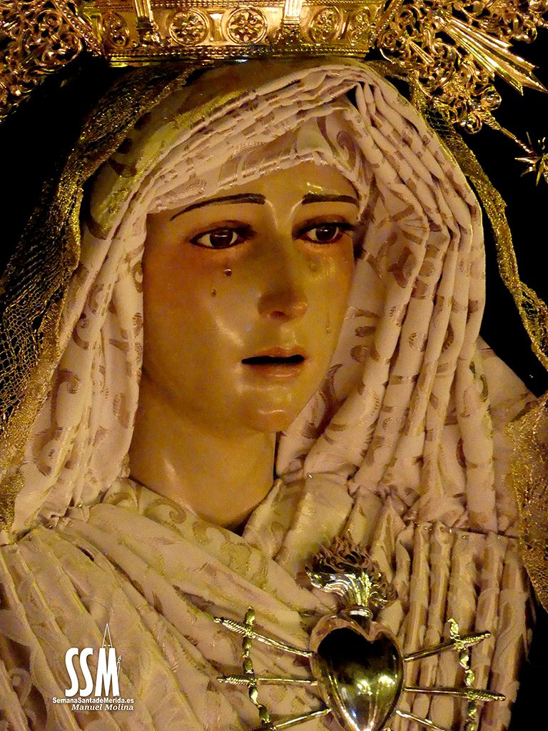 María nunca está sola en Mérida, ni tampoco lo estuvo en la desapacible noche del Viernes Santo cuando, tras un tremendo aguacero que hacía presagiar que haría noche en Santa María, se abrieron los portones para que apareciera la Cruz de Guía y, tras ella, de forma muy compacta la Hermandad del Calvario ante el paso de palio.
