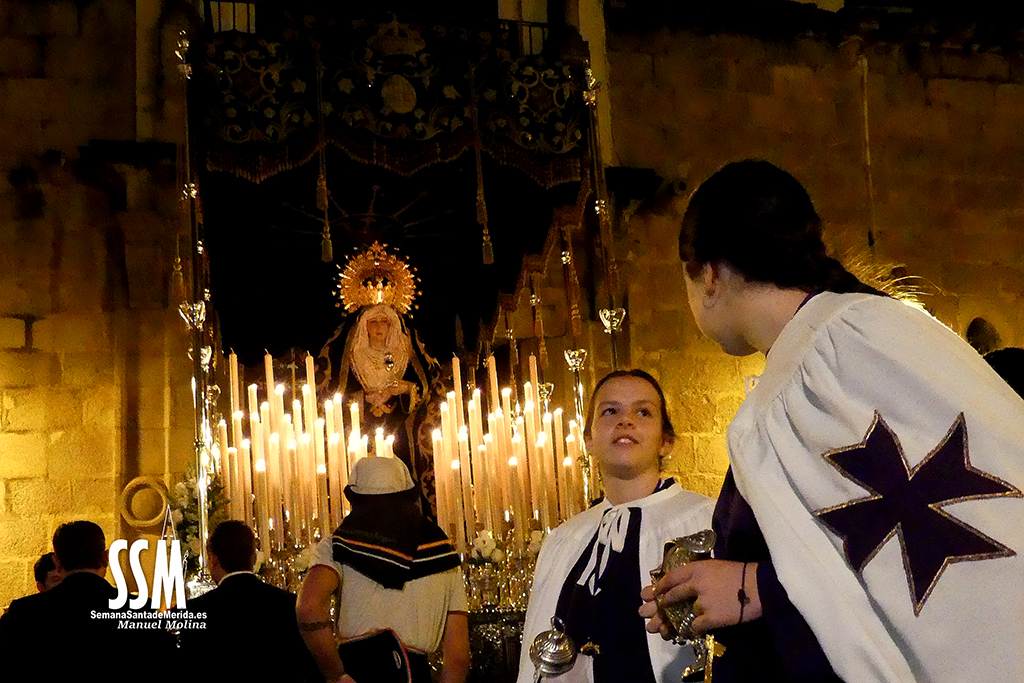 La instantánea… para la historia, para la memoria de estos jóvenes cofrades que han descubierto en la Virgen de los Dolores el faro de sus devociones. El palio comenzó a andar lentamente buscando la calle San Salvador para retornar a la Ermita del Calvario. ¿Un Santo Entierro inacabado? No, el Señor quedó en la Concatedral mientras la Virgen de los Dolores se marchaba en una Soledad arropada por los emeritenses, hacia la Ermita del Calvario a la espera de la Resurrección.