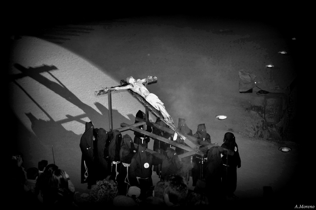 En el interior del Anfiteatro Romano todo está preparado para recibirle, una gran cruz formada por grandes velas ubicadas en braseros, ilumina el foso de este edificio con más de dos mil años de historia, declarado Patrimonio de la Humanidad, coetáneo de Jesucristo. Alrededor de su arena se han distribuido las Estaciones del Vía Crucis. La Capilla Gregoriana del Santísimo Cristo del Calvario, ocupa su lugar para dar comienzo a este acto de oración y reflexión. El público comienza a entrar en silencio, y va ocupando las zonas del graderío preparadas para acogerlos. Fuera, a lo lejos, se comienza a escuchar el sonido de los tambores que anuncia la inminente llegada del Cristo de la O. Legionarios romanos de la “Leg. V Alaudae” salen a su encuentro para introducirlo y abrirle paso hasta el Anfiteatro. Una vez en la puerta lateral del edificio, el público que acompaña a la imagen accede primero a su interior, mientras el Cristo de la O espera hasta que todo el público se encuentra acomodado. Los legionarios de la V “Alaudae” van tomando posiciones en cada una de las estaciones del Vía Crucis, así como los nazarenos que acompañan al Cristo y la Capilla Gregoriana rompe el silencio de la noche para iniciar el cántico del “Miserere mei Deus”.