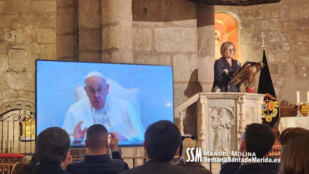 Toda una sorpresa en el Pregón de la Semana Santa de Mérida que ha pronunciado, en la Basílica de Santa Eulalia, la corresponsal de Cope en Italia y la Ciudad del Vaticano, Eva Fernández cuando, en un momento de su disertación ha anunciado “ciudadanos de Mérida, hay alguien en Roma que hoy quiere estar presente entre vosotros. Un auténtico honor, un privilegio para esta ciudad que siempre será recordado. Santo Padre, para usted la palabra en este pregón…”