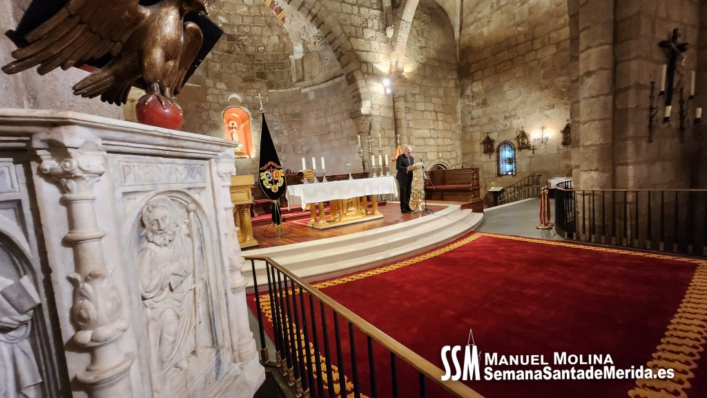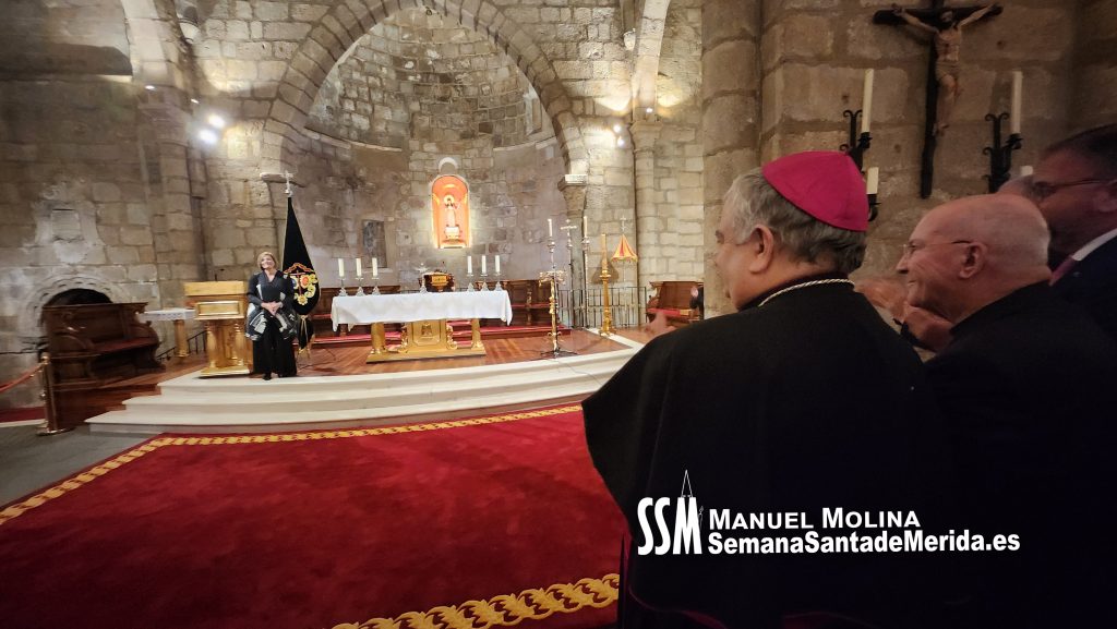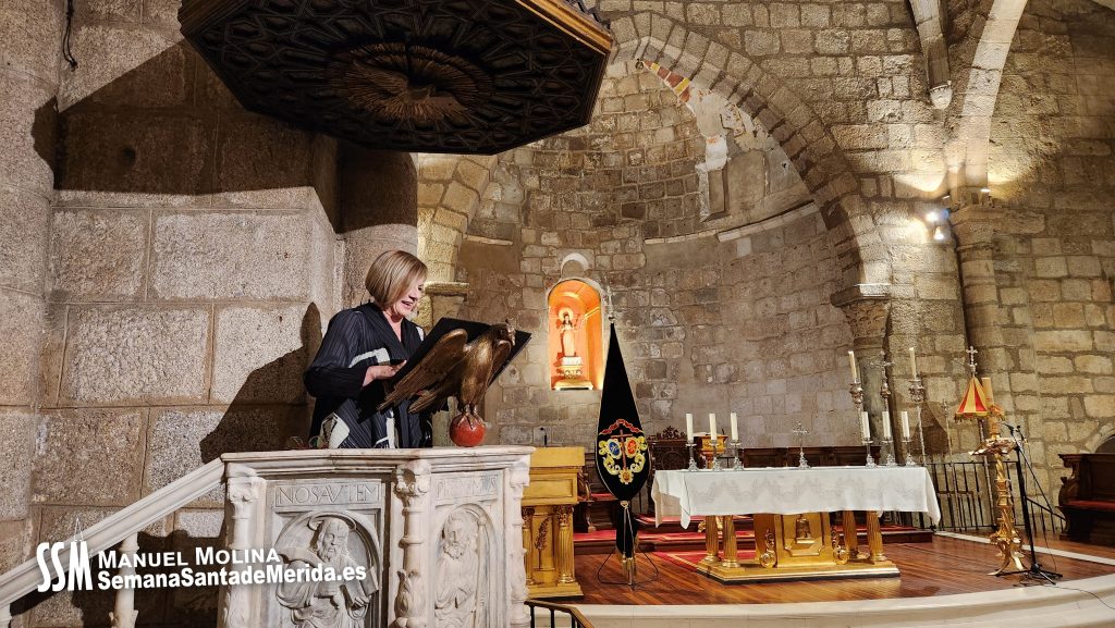 Eva Fernández, que ha recordado en su pregón que el pasado año se autoproclamó “Embajadora de Mérida en el Vaticano” ha continuado su pregón marcando un paso firme en la Basílica que “huele a memoria macerada durante siglos por la fe y el sacrificio de los primeros cristianos. Adentrarse por los laberintos de lo que fue la antigua basílica paleocristiana, detenerse ante los símbolos por los que daban la vida, invita a replantearte lo cómodo que resulta ovillarse en un rincón cuando descubres que matar por odio a la fe, sigue tan vigente como en tiempos de Nerón, Domiciano, Trajano o Diocleciano”.