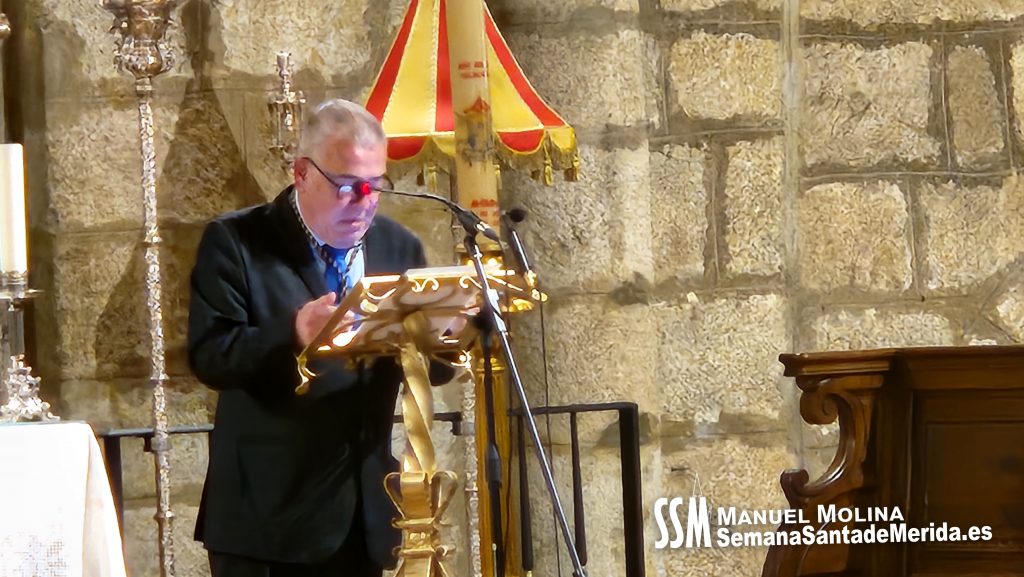 - “Ciudadanos de Mérida, hay alguien en Roma que hoy quiere estar presente entre vosotros. Un auténtico honor, un privilegio para esta ciudad que siempre será recordado. Santo Padre, para usted la palabra en este pregón…” así lo ha anunciado la Pregonera.