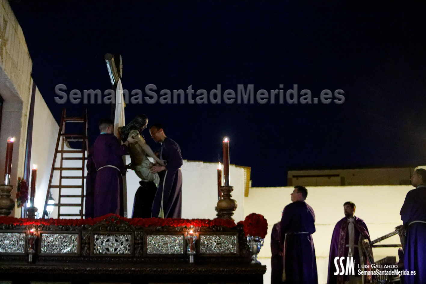 Nos disponemos a desclavar al cuerpo del Señor, y cada clavo parece atravesarnos el corazón cuando atraviesa cada una de sus manos y sus pies; la corona que riega de sangre su rostro es la corona con la que reinan aquéllos poderosos cuya ambición vive del miedo de los humildes. Ya no se oye nada, nada en absoluto, incluso la campana ha enmudecido ante tan dramática escena, solo el leve viento entre los árboles acompaña.