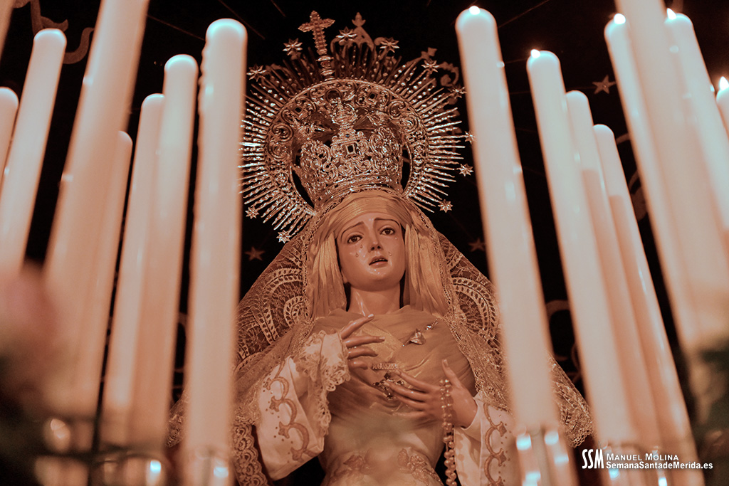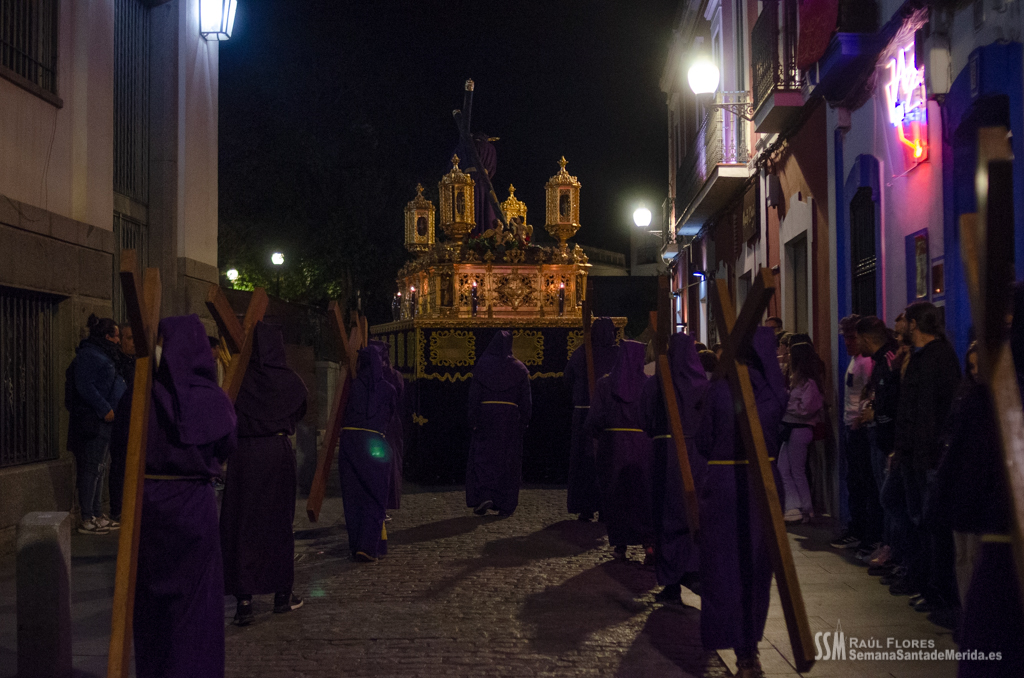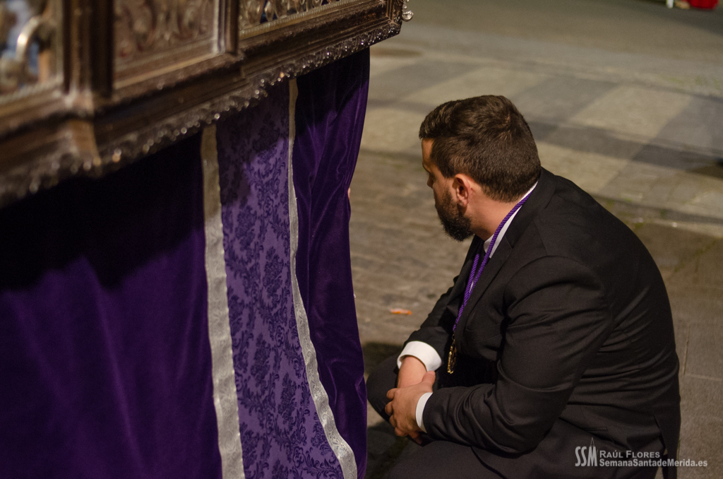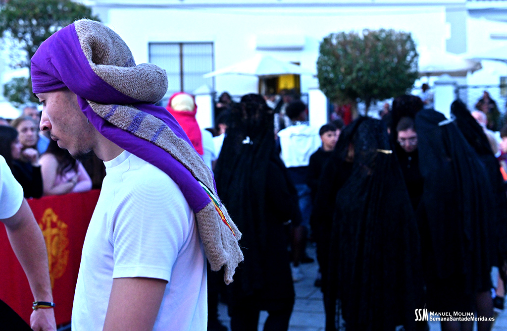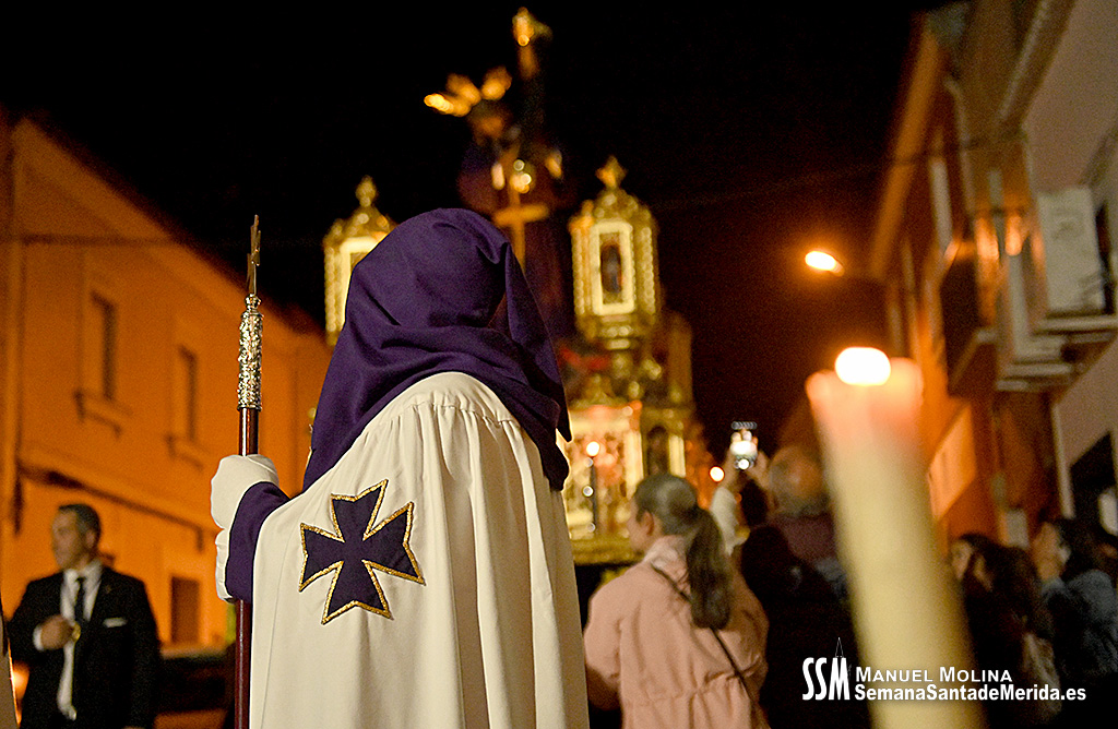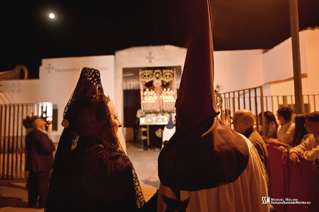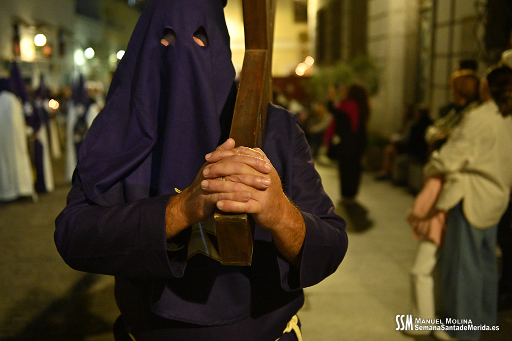 En el alto del calvario se funde la luz de los cirios, el negro de la noche y el “morao” que le da identidad a la Hermandad. Se mezcla el sentimiento del dolor amargo de una madre, con la fe de quienes procesiona por ellos. El esfuerzo, las ganas y la apuesta por estar allí un año más. Y en el recuerdo de Mérida, una Oración brillante, la Flagelación imponente, la solemnidad del Nazareno y el hermoso rostro de la Amargura.