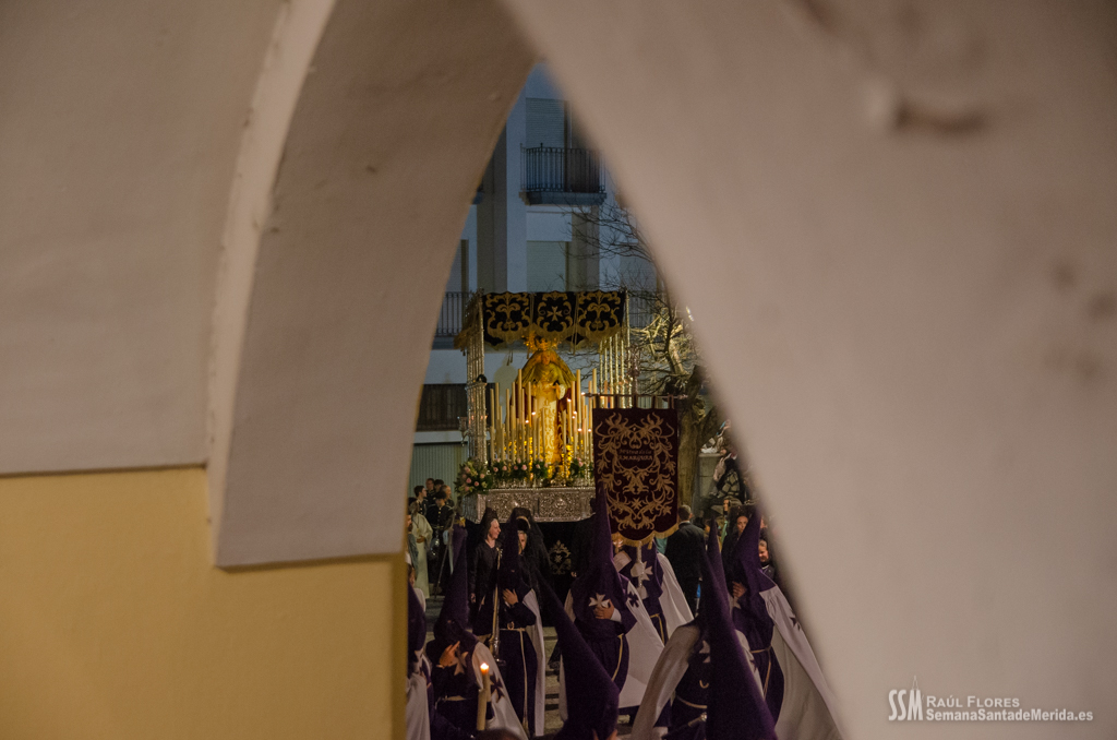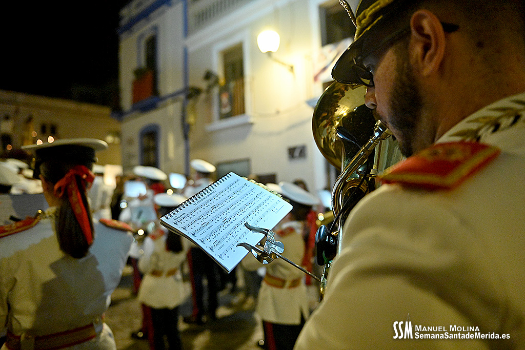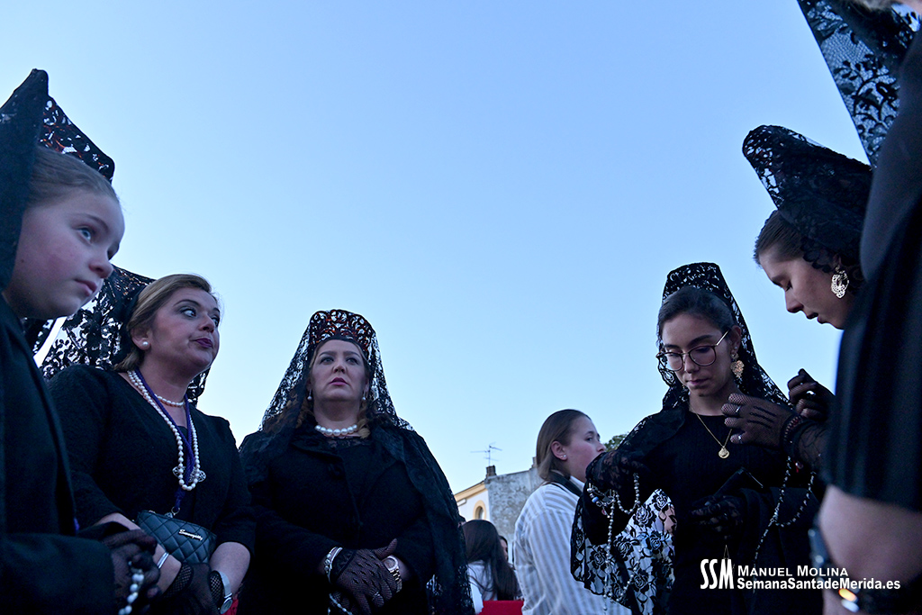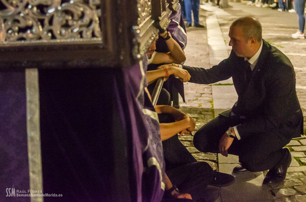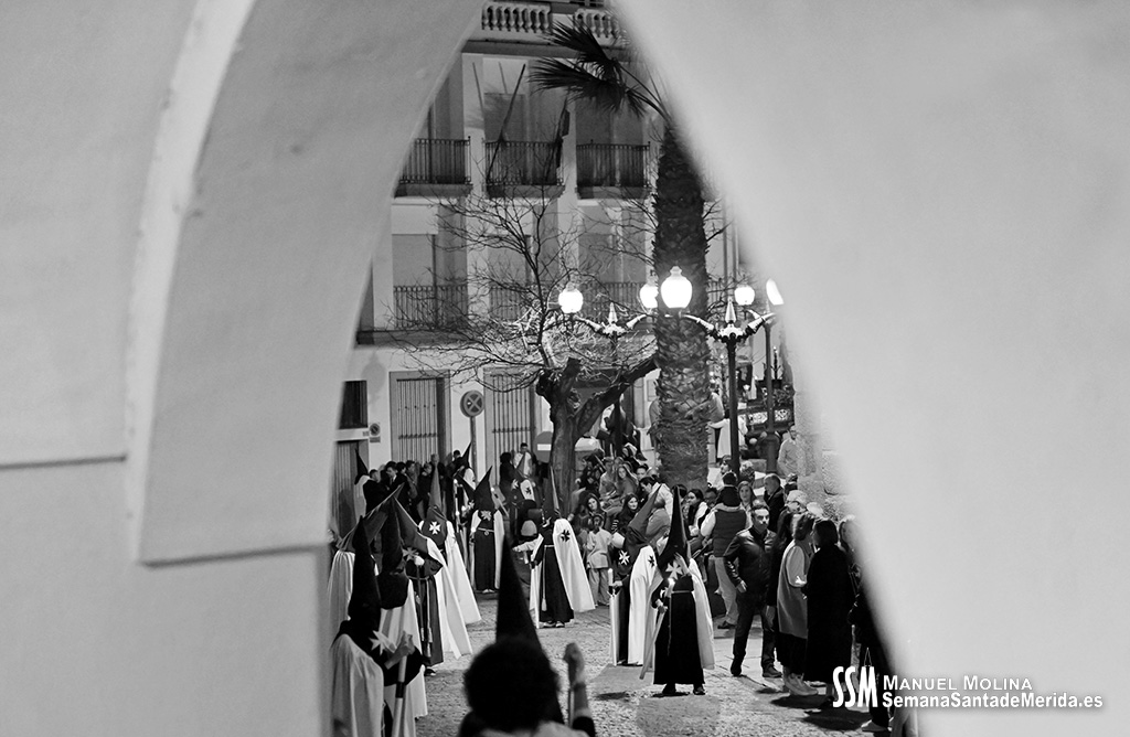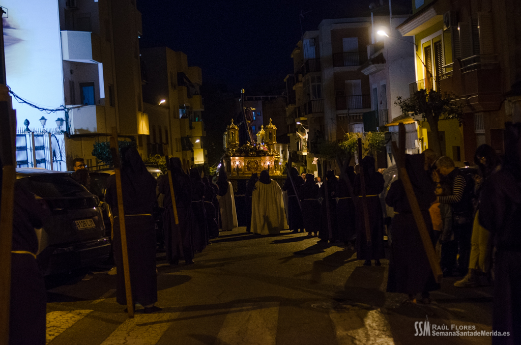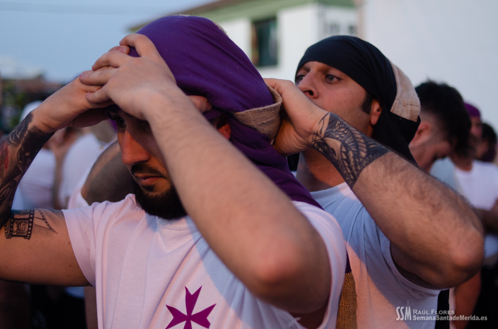 En el alto del calvario se funde la luz de los cirios, el negro de la noche y el “morao” que le da identidad a la Hermandad. Se mezcla el sentimiento del dolor amargo de una madre, con la fe de quienes procesiona por ellos. El esfuerzo, las ganas y la apuesta por estar allí un año más. Y en el recuerdo de Mérida, una Oración brillante, la Flagelación imponente, la solemnidad del Nazareno y el hermoso rostro de la Amargura.